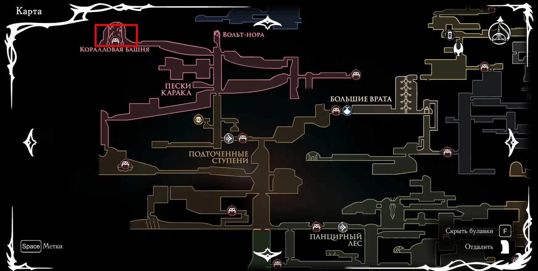 Коралловый штык. Создает вертикальный столб, выстреливающий из пола прямо под Хорнет. Смотрим на клубы пыли и держимся от них подальше.