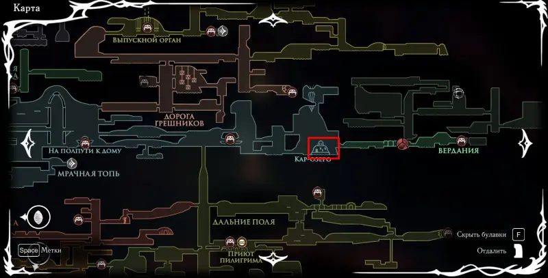 Вернувшись с этим на Кар-озеро, найдите в главном зале здания неприметную железную дверь внизу. Предъявите ей пропуск, и вы попадете в подземный зал суда, где и встретитесь с Отцом Каров.