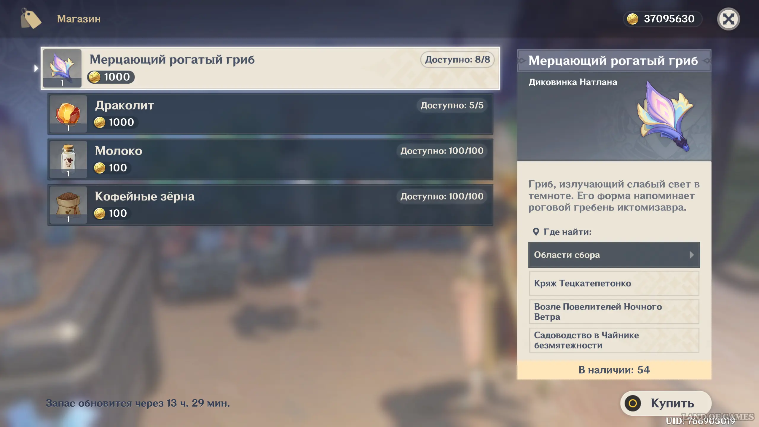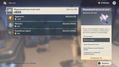 - Мерцающий рогатый гриб (стоимость: 1000, количество: 8)