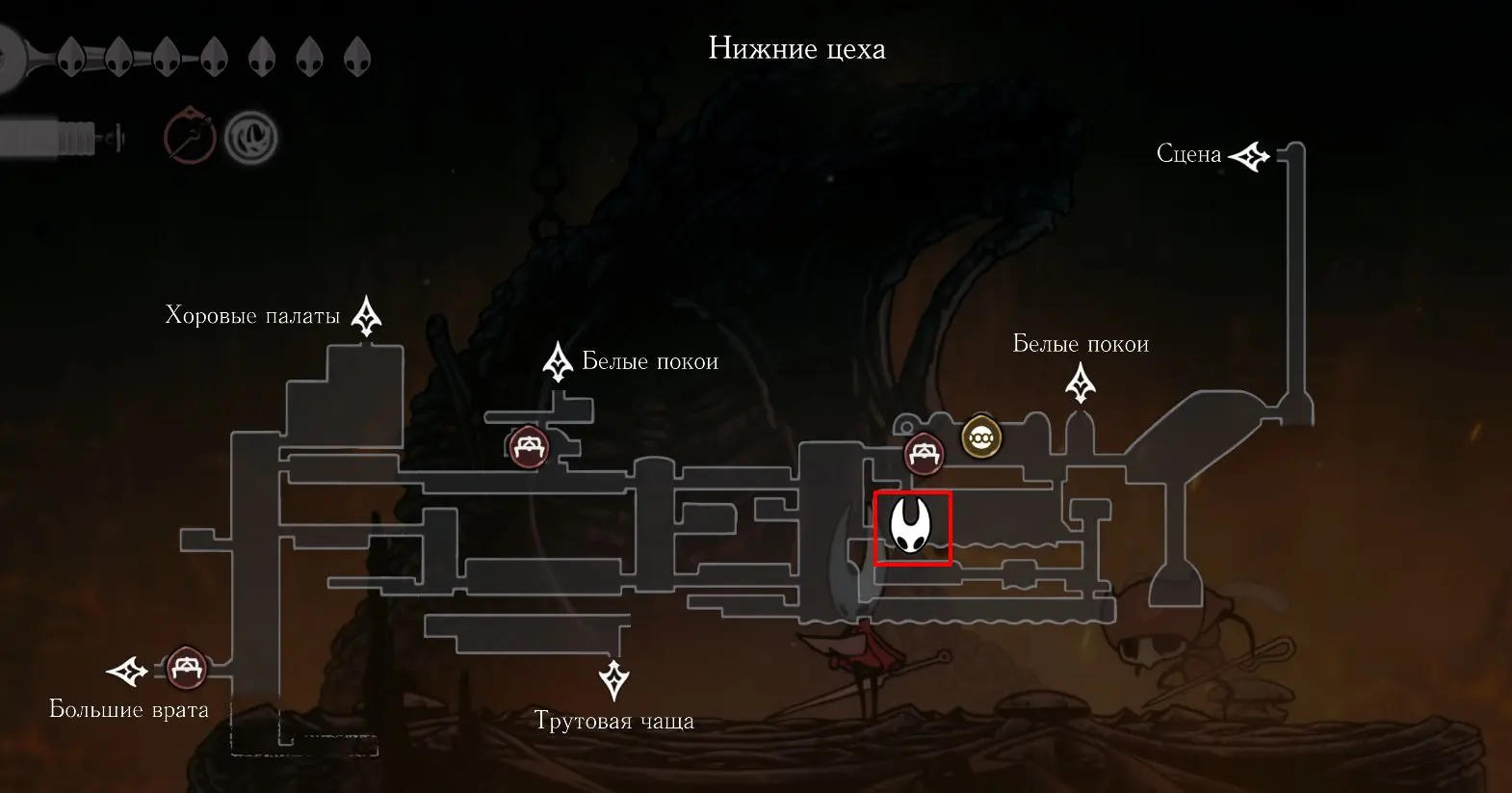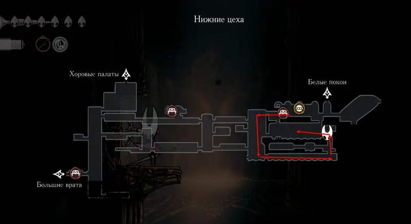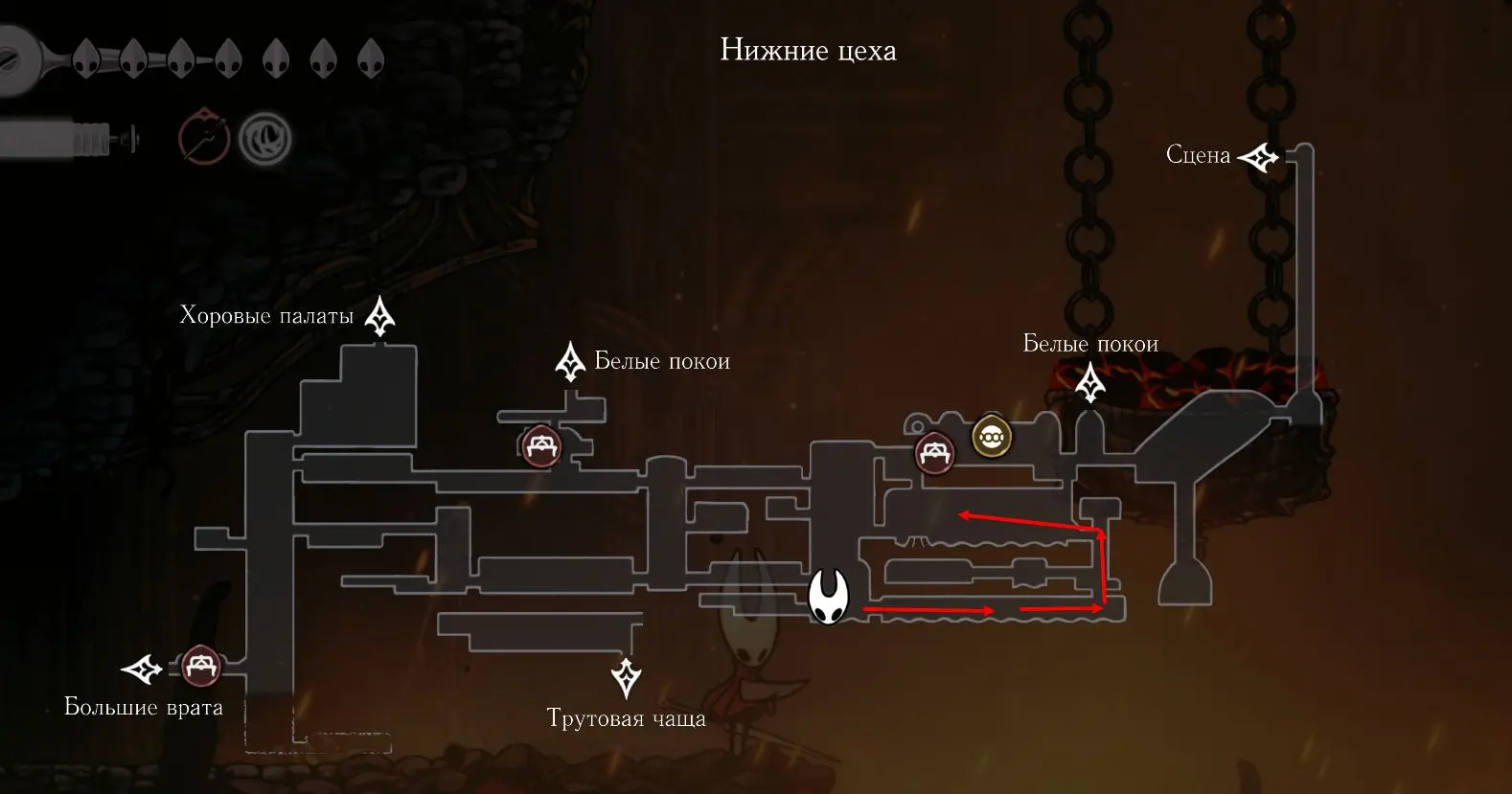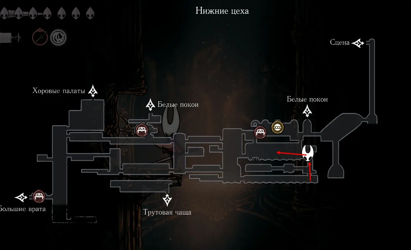 Представленный навык спрятан в «Нижних цехах». Перед этим потребуется пройти «Хоровые палаты» и обязательно посетить «Белые покои», откуда и попадем в правую часть «Нижних цехов».