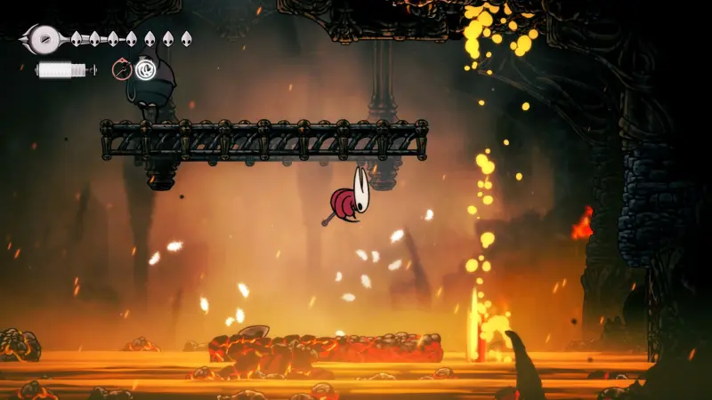 Далее предстоит прыгать по таким же хрупким платформам, сверху будет падать лава — перепрыгиваем осторожно, чтобы оказаться под горящим потоком. На пути встретите одного взрывного жука. Доходим до конца. Сверху будет платформа с противником, с помощью цепкого захвата залезьте к нему и прыгайте в люк в потолке.