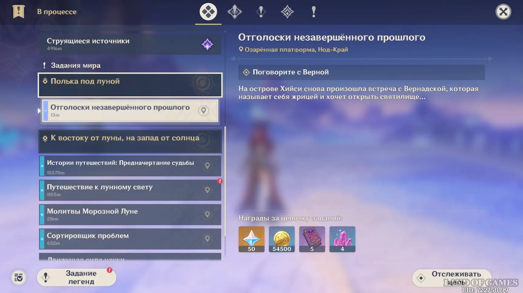 В этом задании вы наконец-то сможете отправиться в Нод-Край, считающийся раем для странников и искателей путешественников. Здесь вам предстоит познакомиться с массой новых удивительных персонажей и столкнуться с ужасной Дикой Охотой. Вы сначала осмотрите Нашгород, потом посетите Анклав Морозной Луны и встретитесь с братом/сестрой, а также проникните в святилище и проберетесь в Экспериментальное конструкторское бюро Фатуи. Подробнее об этом мы рассказали в отдельном материале.