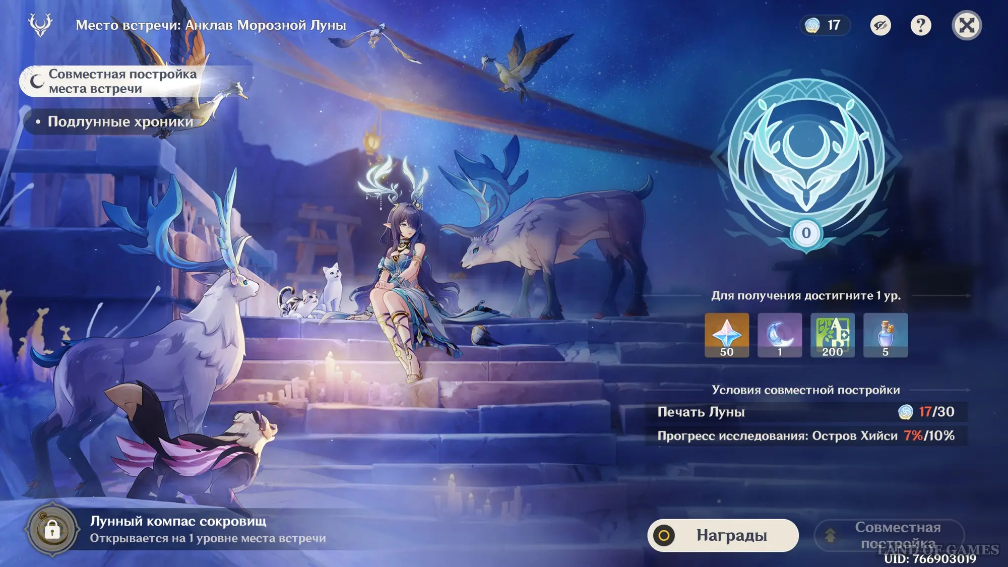 В награду за совместную постройку Мест встречи вы не только будете получать камни истока, предметы декора и ключи от усыпальниц глубин пограничья, но также откроете Лунный компас сокровищ и сможете улучшать его уровень исследовательского потенциала для конкретной области. В отдельном руководстве мы в подробностях рассказали об открытии системы репутации в лунном регионе и о том, как она действует.