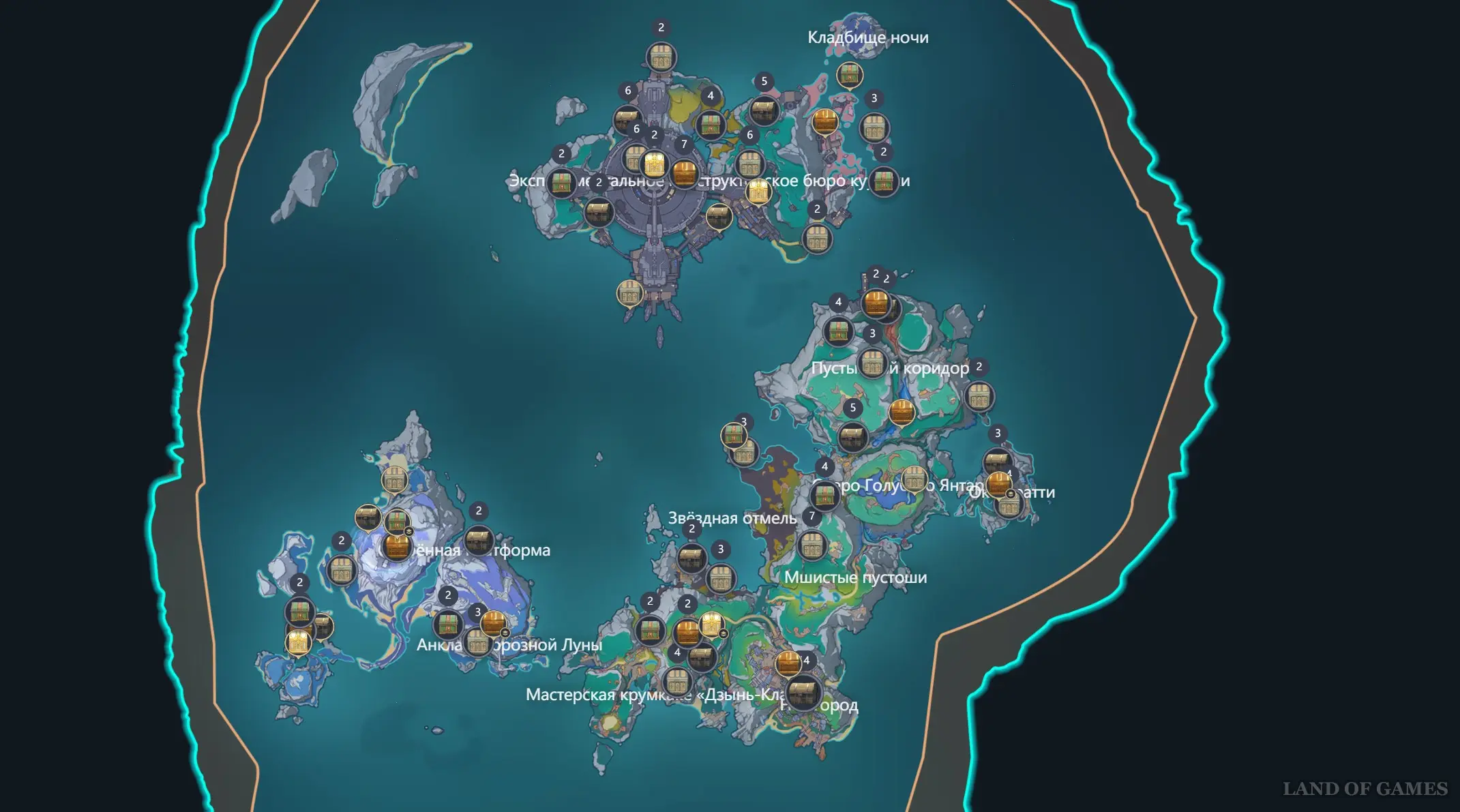 Интерактивная карта Нод-Края позволит вам очень быстро выяснить расположение всех ресурсов, местных диковин, магазинов, врагов, руды, лунокулов, загадок, животных, персонажей, телепортов, материалов, подземелий и других объектов северного региона. Она переведена на русский язык и позволяет запоминать достигнутый прогресс. Ознакомиться с ней можно на отдельной странице.