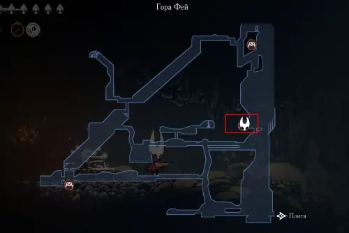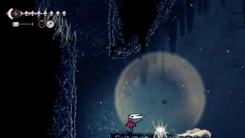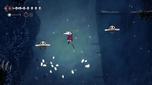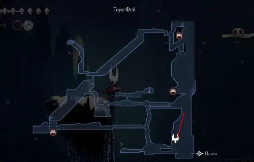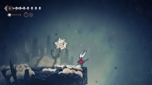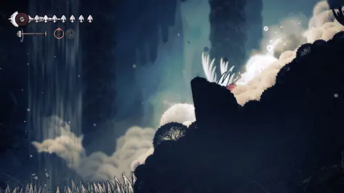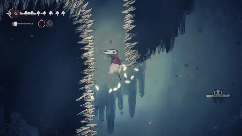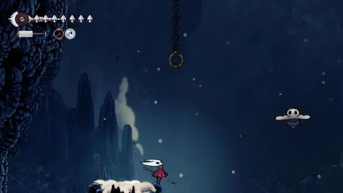 Осталось совсем немного! Прыгаем в верхний переход. Затем на маленькую платформу и дальше наверх по стене. Летим в левую сторону от скалы и падаем в лавину. Она приведет нас к воздушному потоку, который принесет Хорнет на самую вершину прямо к алтарю с навыком «Двойной прыжок».