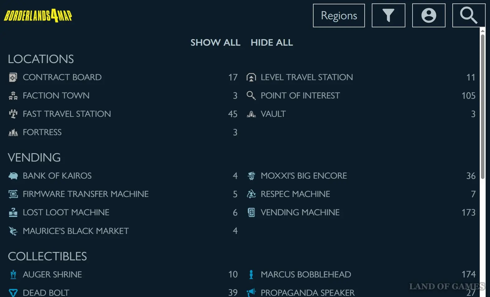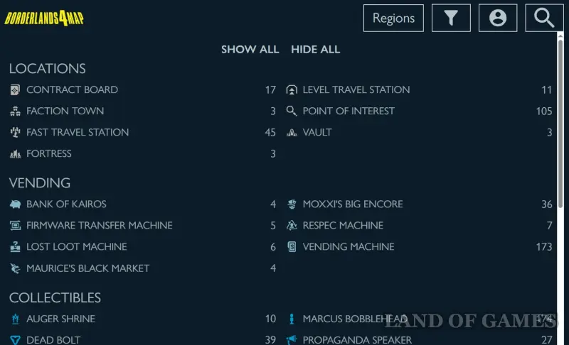Надеемся, что интерактивная карта Borderlands 4 поможет вам отыскать все сундуки, торговые автоматы, первозданные хранилища, квесты фракций, контракты, боссов, легендарное снаряжение и другие интересные объекты в игровом мире.