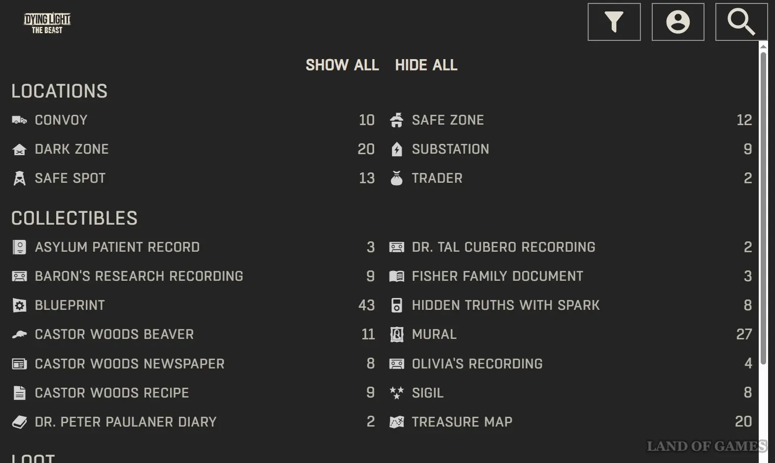 Для изменения масштаба, используйте кнопки «+» и «-», находящиеся в нижнем правом углу экрана. Если же сама карта кажется вам недостаточно большой, то просто увеличьте размеры страницы сайта, воспользовавшись комбинацией «Ctrl + колесико мыши». Ниже дан список всех предметов, которые имеются в Dying Light The Beast.