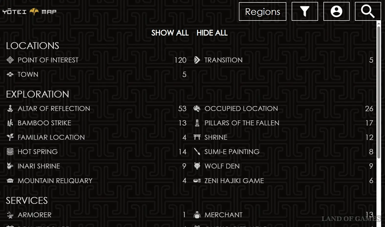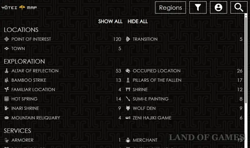 В Ghost of Yotei карта заметно упрощает нахождение разнообразных предметов и объектов. Пользуясь ею, вы сможете без проблем выяснить, где можно найти все оружие, доспехи, амулеты, алтари отражения, святилища, сказания, цели для наград за голову, горячие источники, рисунки суми-э и головоломки.