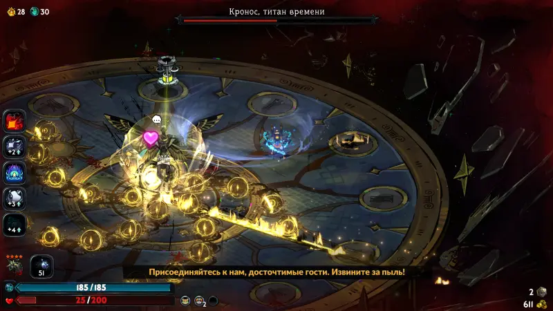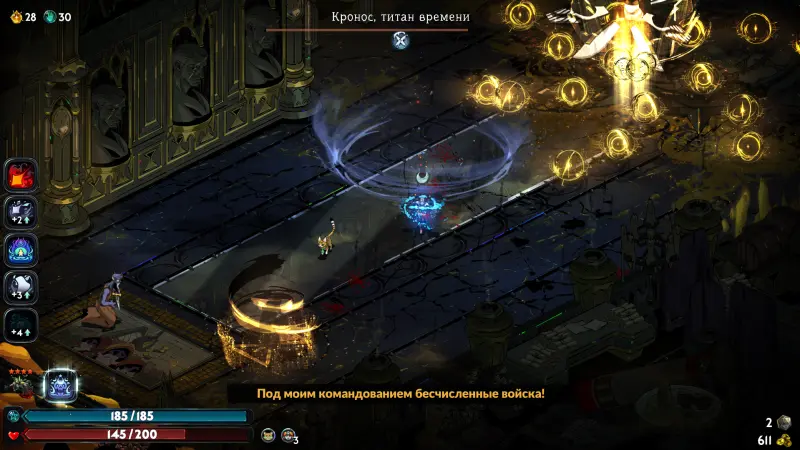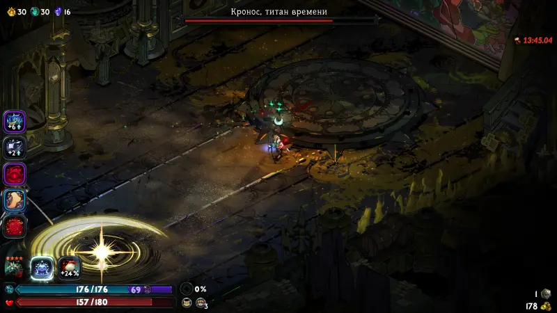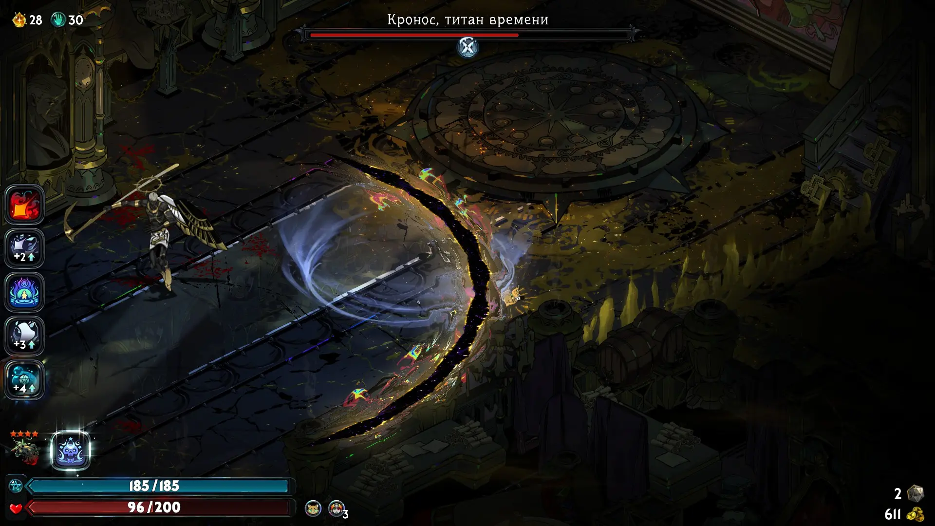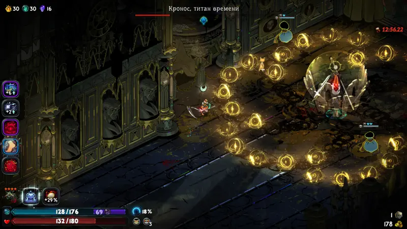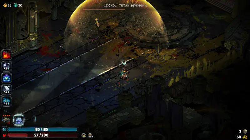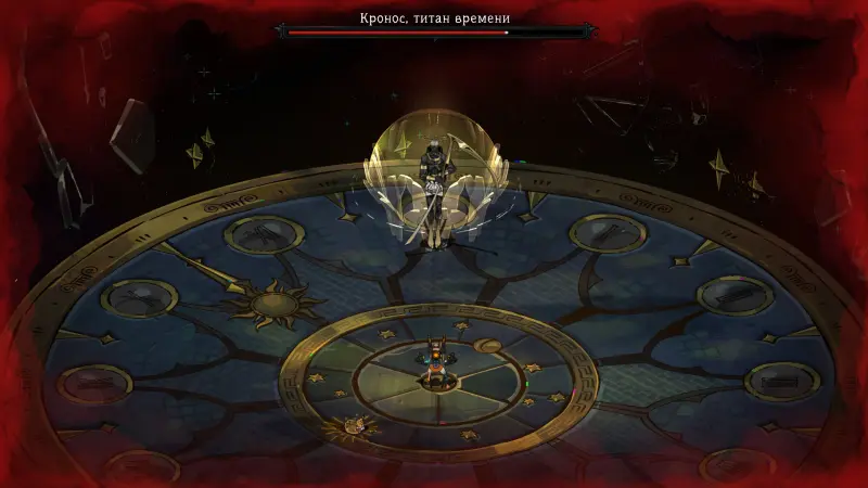 Еще одним условием, значительно облегчающим бой, является помощь от Аида. Его можно встретить в Тартаре (комната с ним обозначена специальным символом, выделенным на скриншоте выше). Любой его дар либо значительно усиливает Мелиною, либо значительно ослабляет Кроноса. Если у вас проблемы с личным уроном Мелинои, рекомендуем выбрать Рывок Гигароса, наносящий дополнительный урон противникам после рывка и к тому же ослабляющий их, если главной сложностью является Кронос, лучшим выбором будут Глубокий спуск или Старые распри. Первый дар снижает количество союзников Кроноса, второй автоматически наносит боссу большой урон в начале битвы — оба этих эффекта могут сыграть огромную роль в сражении.