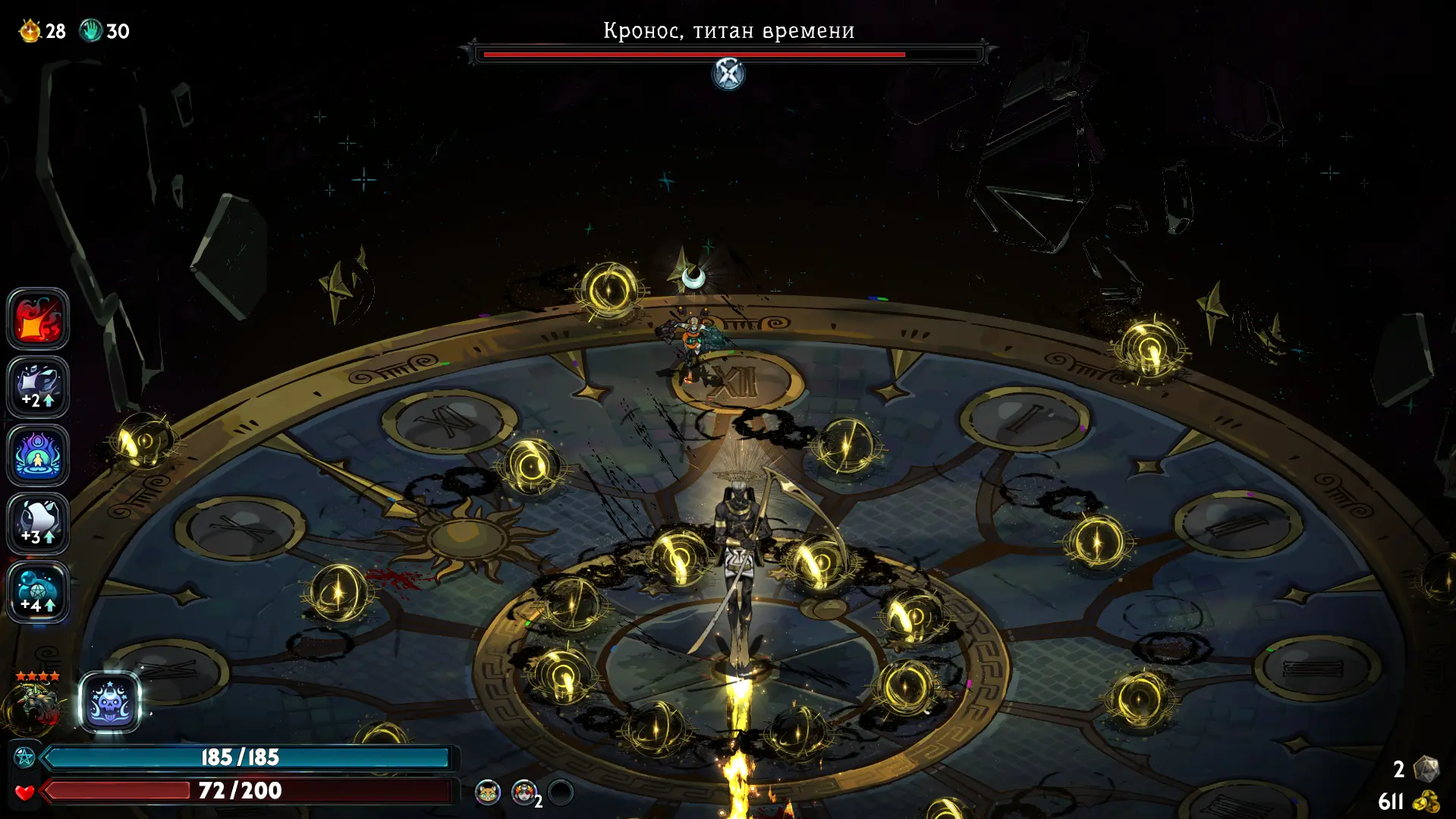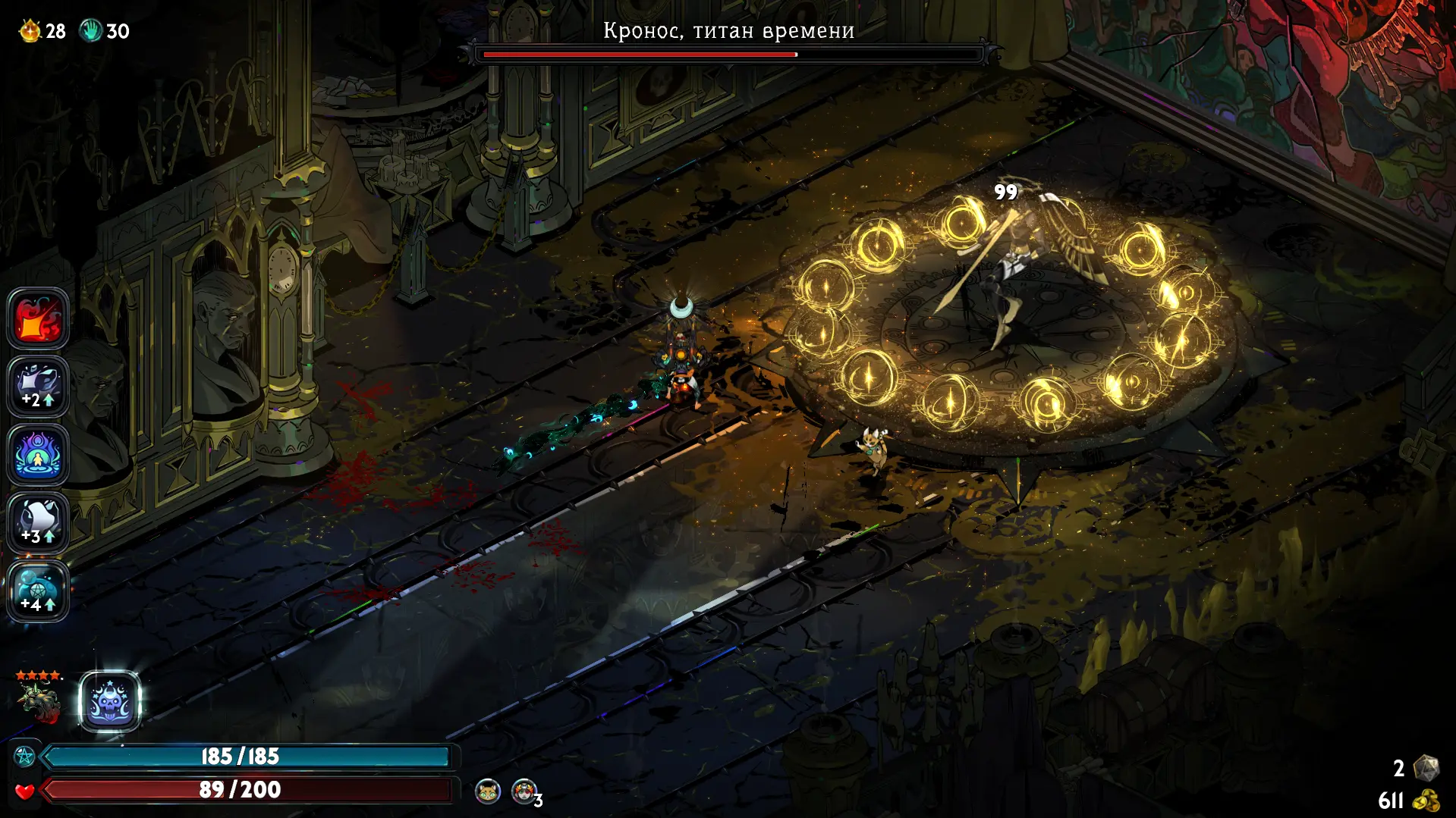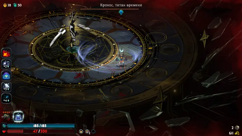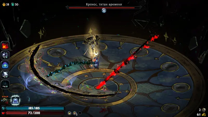 Во второй фазе следует учесть один важный момент: пока заряжаются некоторые атаки (в частности, первые две), сам Кронос фактически остается на месте и ничего не делает. Если вы успели занять выгодную позицию и у вас есть атаки, бьющие на расстоянии, в идеале по большой площади, самое время их использовать. Таких приемов в игре достаточно много, но особенно выделяются Полное затмение от Селены, наносящее огромный урон по площади, и Тлеющий уголек от Гестии, накладывающий Горение. К тому же, если в первой фазе Кронос использует удары косой практически без перерыва, в связи с чем быстро подобраться поближе затруднительно, то во второй он все же чередует их с атаками, влияющими не на персонажей, а на арену (к примеру, стрелки часов). То есть, вполне возможно использовать уже упоминавшийся прием: подождать активации подобных атак (исключая наносящие смертельный урон), быстро приблизиться к боссу, нанести столько урона, сколько возможно, быстро отойти на безопасное расстояние.