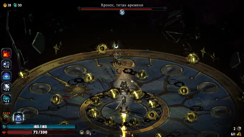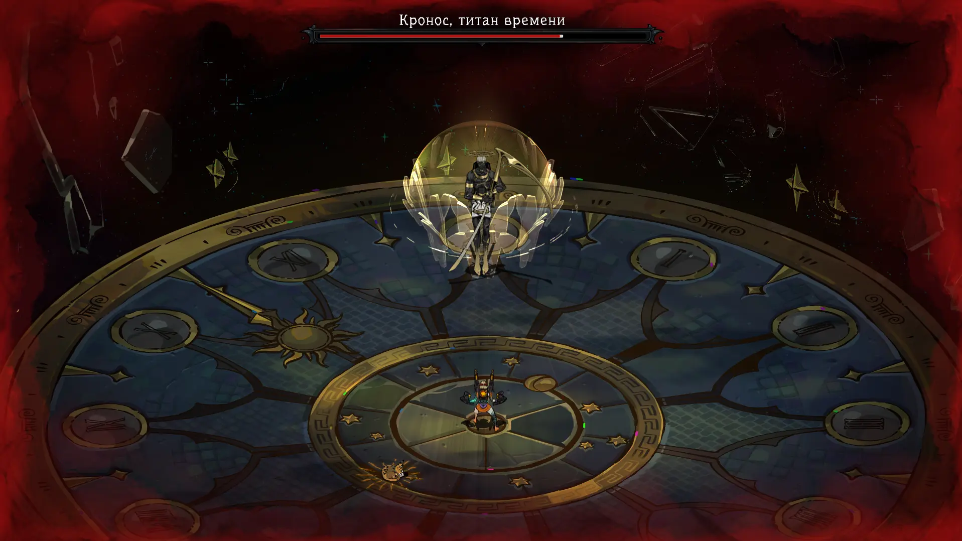 Кронос создает стрелку на часах, которая постепенно перемещается по полю (двигается по часовой стрелке). Если Мелиноя заденет ее, то получит урон. Ближе к концу боя Кронос начнет призывать гораздо больше стрелок, закрывающих почти всю арену.
