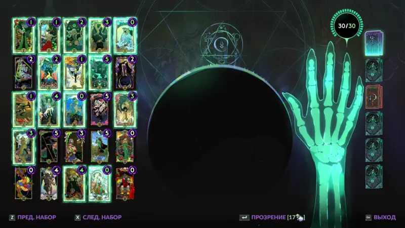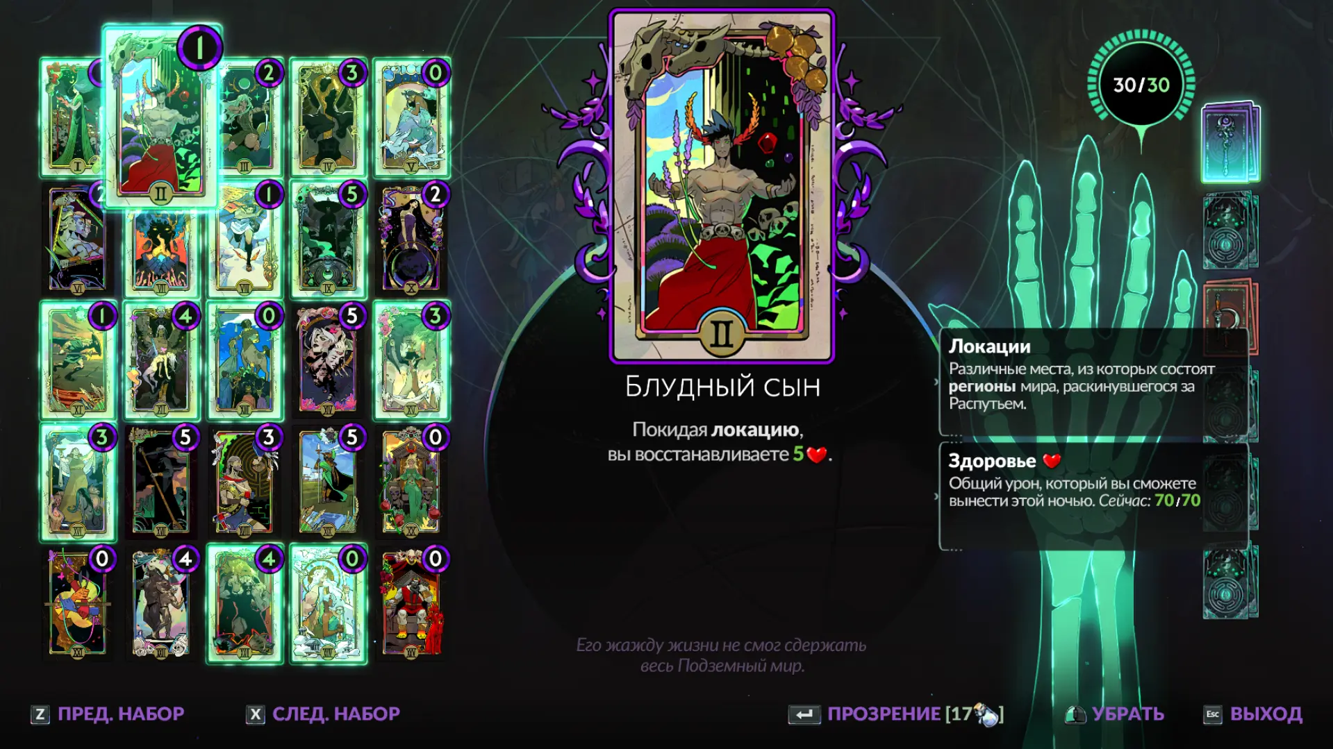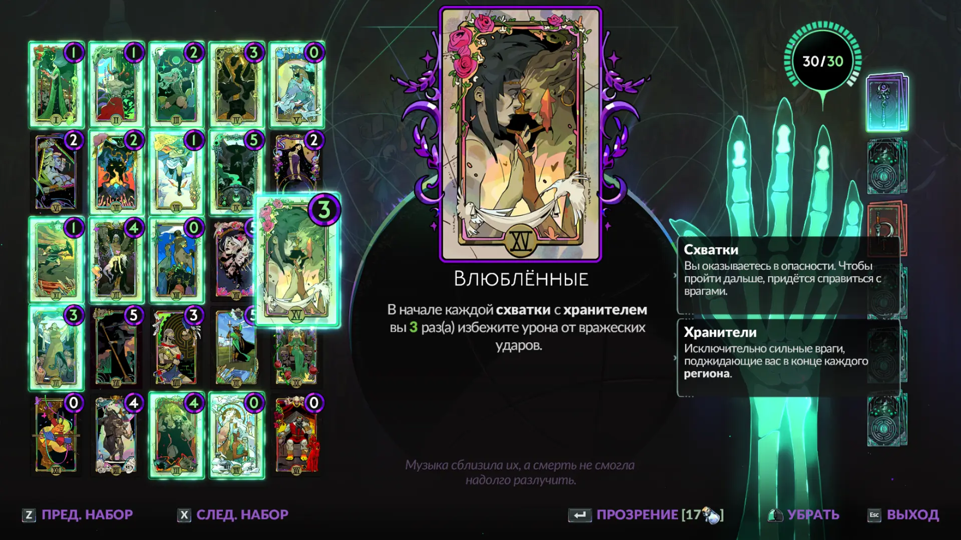 Максимально полезным будет аркан Смерть, который позволит 1 раз (при полной прокачке 3) пережить смертельный урон, на случай если вы не успели увернуться от смертельных атак во второй фазе. Блудный сын позволяет восстановить немного здоровья, покидая локацию, что может стать неплохим подспорьем. Карта Незримые автоматически восстанавливает магию, что необходимо на любой стадии игры, так как приемы, для которых магия и требуется, наносят в разы больше урона, чем обычные атаки. Волшебница позволяет тратить меньше времени на зарядку приемов, соответственно, меньше шанс, что зарядку прервет удар врага. Аркан Влюбленные дает щит, позволяющий несколько раз избежать атак босса, что тоже облегчает сражение.