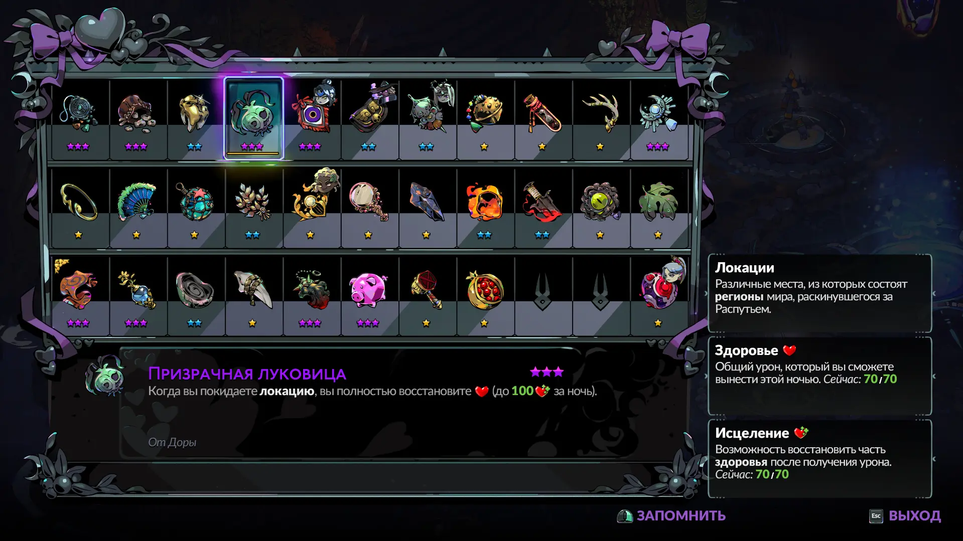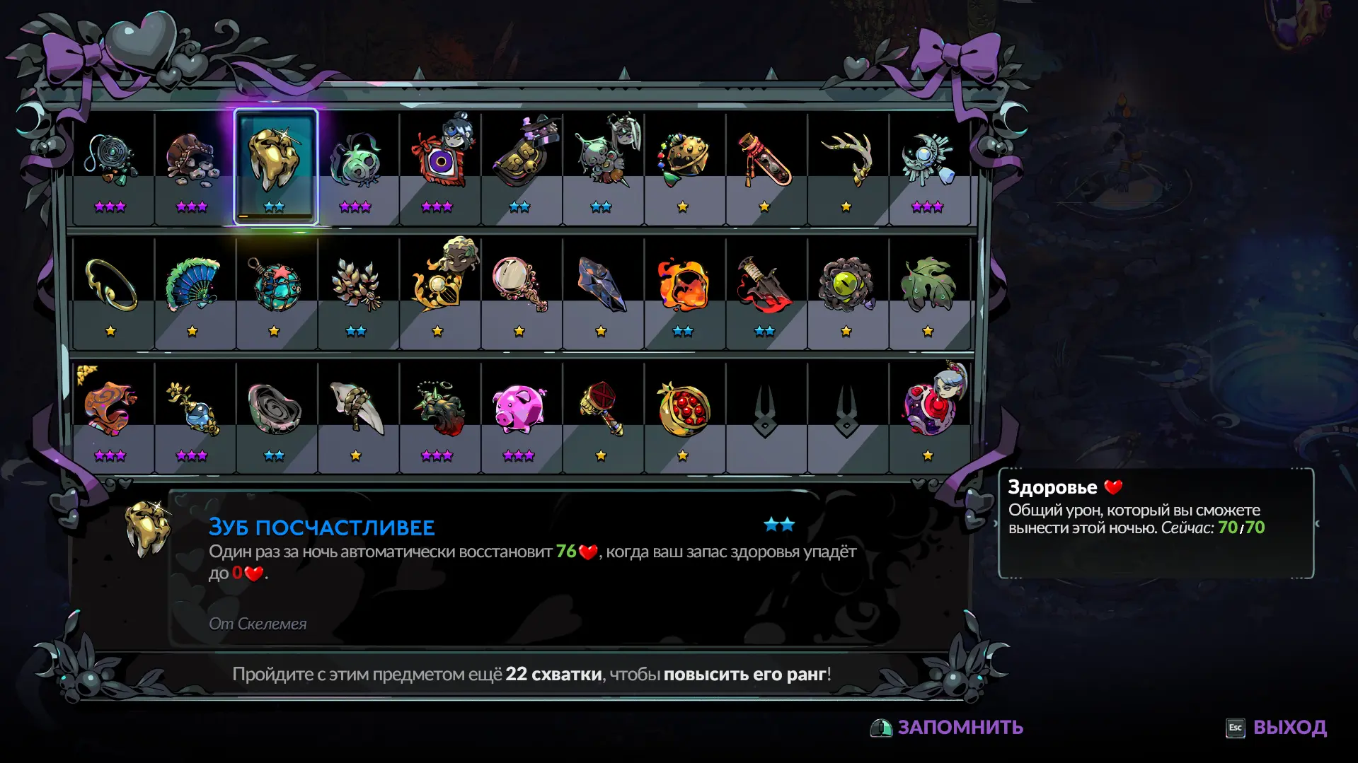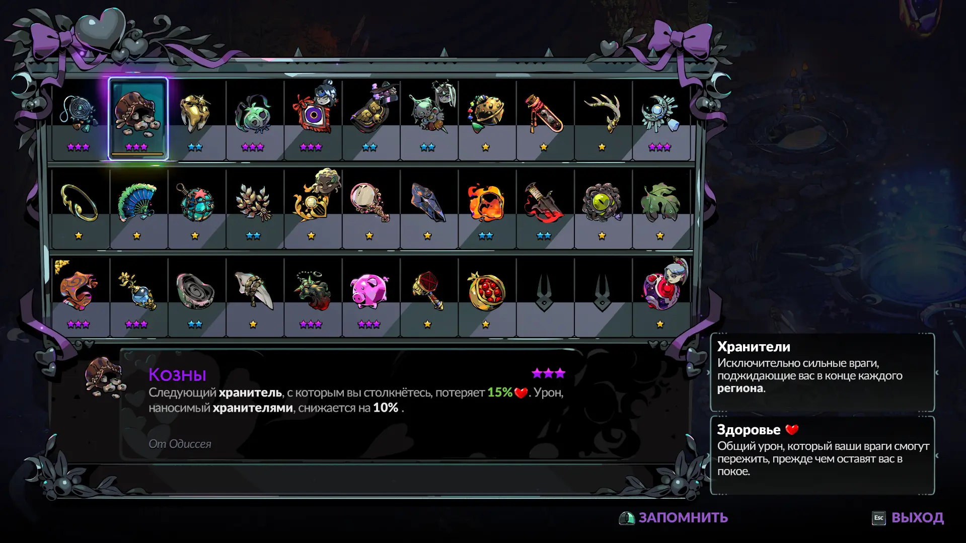 Любой фамильяр очень полезен, особенно если прокачать его до максимума, но сильнее всего выделим Тулу, кошку, которую можно найти на поверхности в Эребе или Фессалийском разломе. Она не только наносит большой урон врагам, но и дает еще один заряд Неповиновения смерти. Также полезны лягушонок Фринос, дающий прибавку к здоровью, и ласка Гали, которая может заблокировать урон от врагов, а также дает прибавку к скорости и шансу уклониться от атак. Отметим, что в отличие от сувениров, которые можно сменить между регионами, фамильяр выбирается до начала забега, и чтобы выбрать заново, придется перезапустить забег.