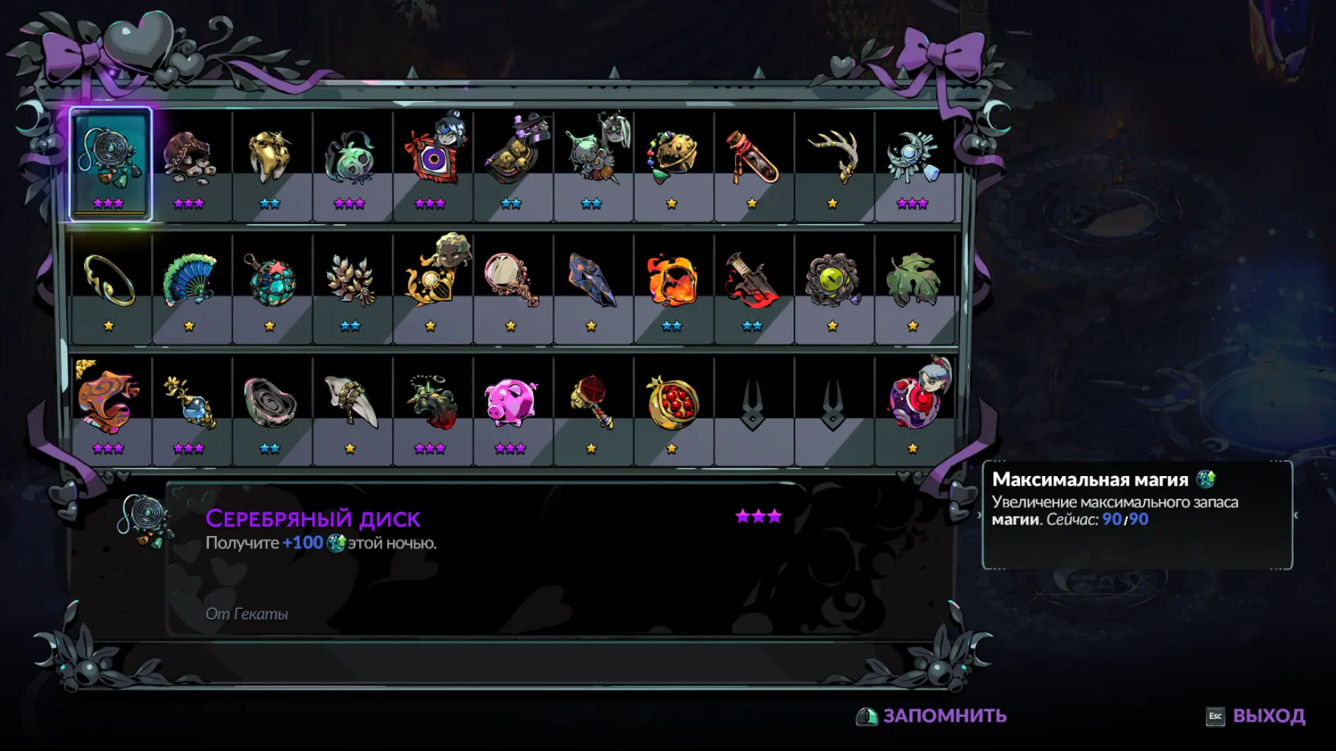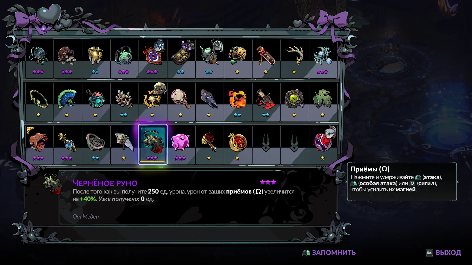 Есть и более специфичные, но сильные сувениры. Если в прошлом прохождении вы не смогли одолеть Кроноса, рекомендуем перед Тартаром взять Дурной глаз (его выдает Немезида). С ним вы будете наносить боссу гораздо больше урона. Также полезным будет Черненое руно от Медеи, которое тоже влияет на личный урон Мелинои. Его условие активации может показаться сложным, но если вы дошли до конца забега, с большой вероятностью 250 урона в сумме вы уже получили.