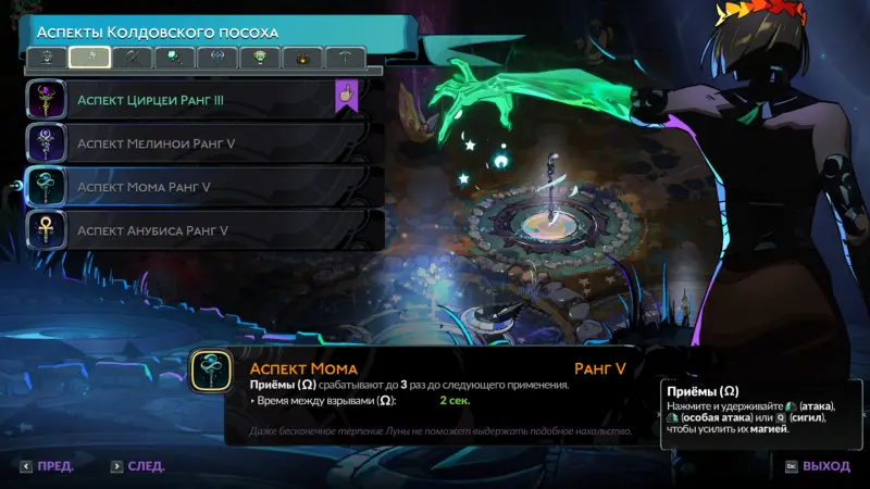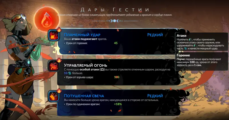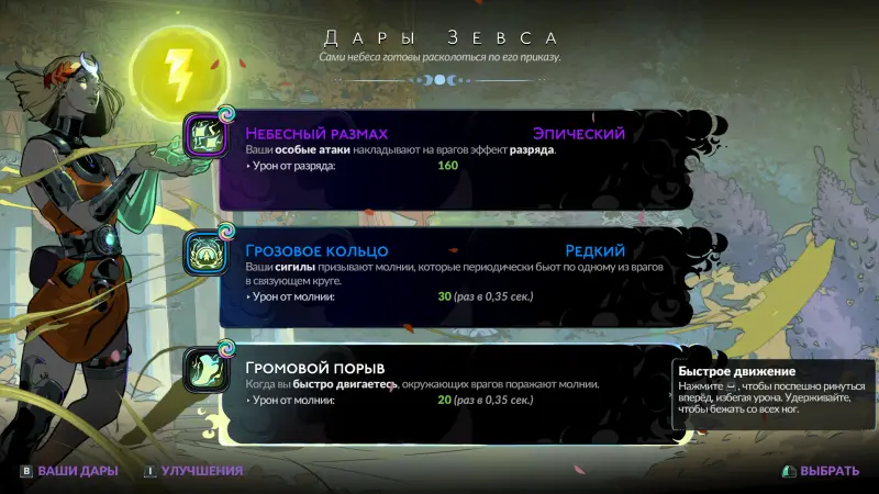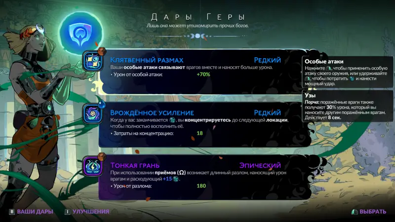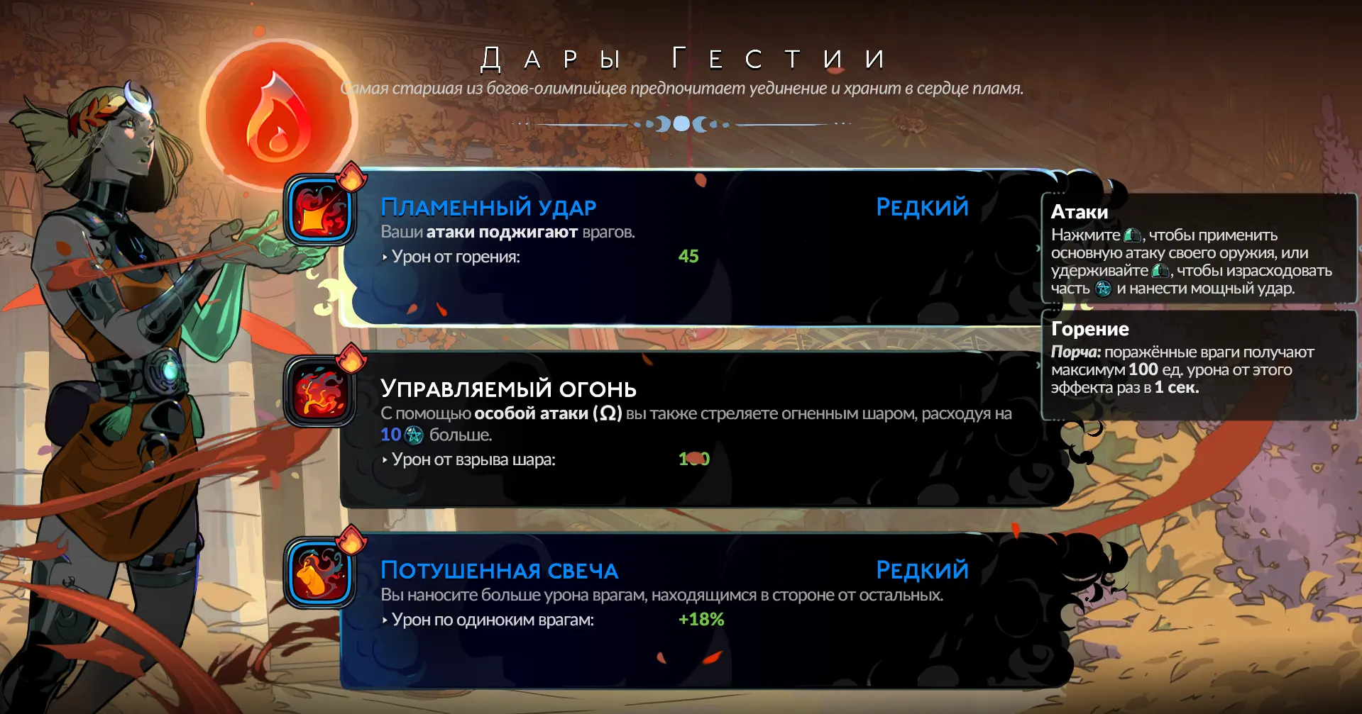 Прекрасным выбором будет любой бонус, наносящий урон врагам после рывка Мелинои, так как уклоняться придется часто. Здесь хорошо проявляют себя дары Зевса (наносящие дополнительный урон) и Афродиты (ослабляющие врагов).