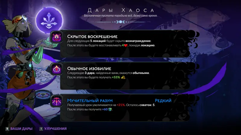 Ну а если вы уверены в своих силах, можно обратиться за помощью к Хаосу. Его дары достаточно хаотичны (в прямом смысле), первое время они не усиливают Мелиною, а, наоборот, накладывают на нее дебаффы. Зато потом начинают работать в полную силу, и чаще всего все неудобства окупаются. Рекомендуем спускаться к Хаосу в начале забега, пока обычные враги сравнительно слабые, чтобы дебаффы не доставили слишком сильных проблем.