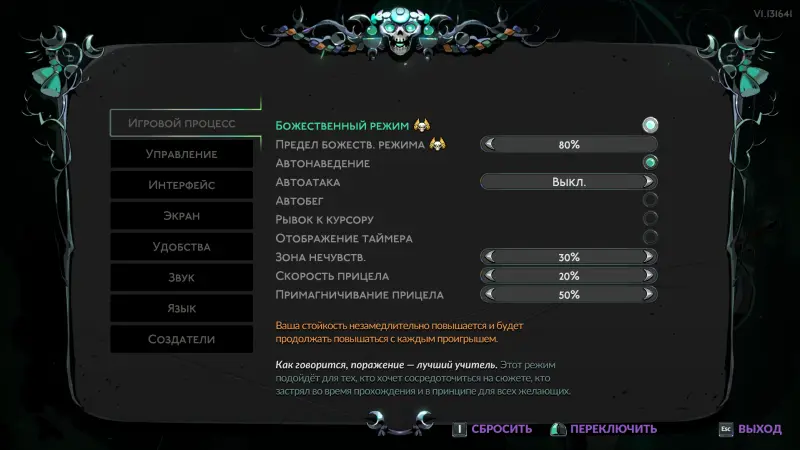 Если, несмотря на все вышеперечисленное, бой остается слишком сложным для вас, в игре есть функция Божественного режима (его можно включить в настройках). После его активации вы автоматически станете получать меньше урона, а с каждым поражением поглощение урона будет дополнительно расти. Максимальное сопротивление — 80%, то есть, от каждой атаки врага вы будете получать только 20%. В остальном Божественный режим нисколько не влияет на игровой процесс, к тому же, включить и отключить его можно в любое время.