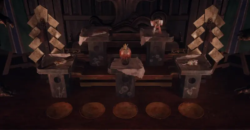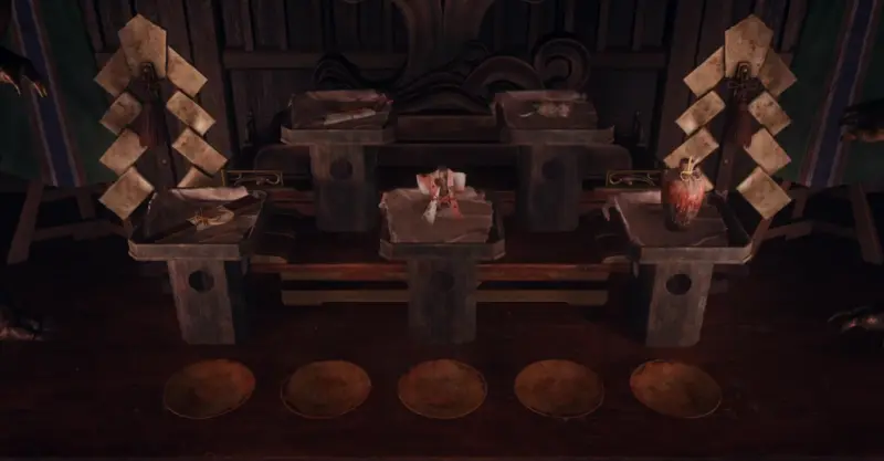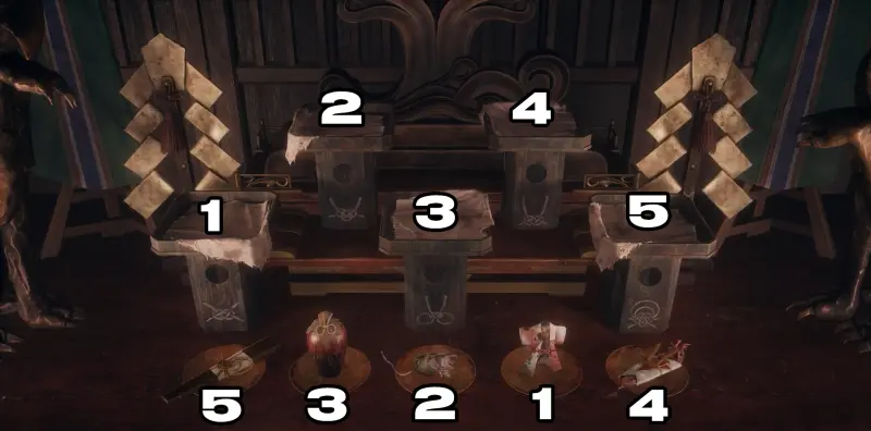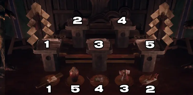 После того как вы победите врагов возле магазина со сладостями «Чизуруя» и потеряете сознание, Хинако очнется внутри храма, после чего подойдет к алтарю – это и есть начало первой головоломки. На алтаре расположены 5 подставок для подношений, а в чашах рядом с ними лежат ритуальные предметы: веер, сосуд, крыса обернутая в лист, птица в кимоно и рыба, завернутая в бумагу.