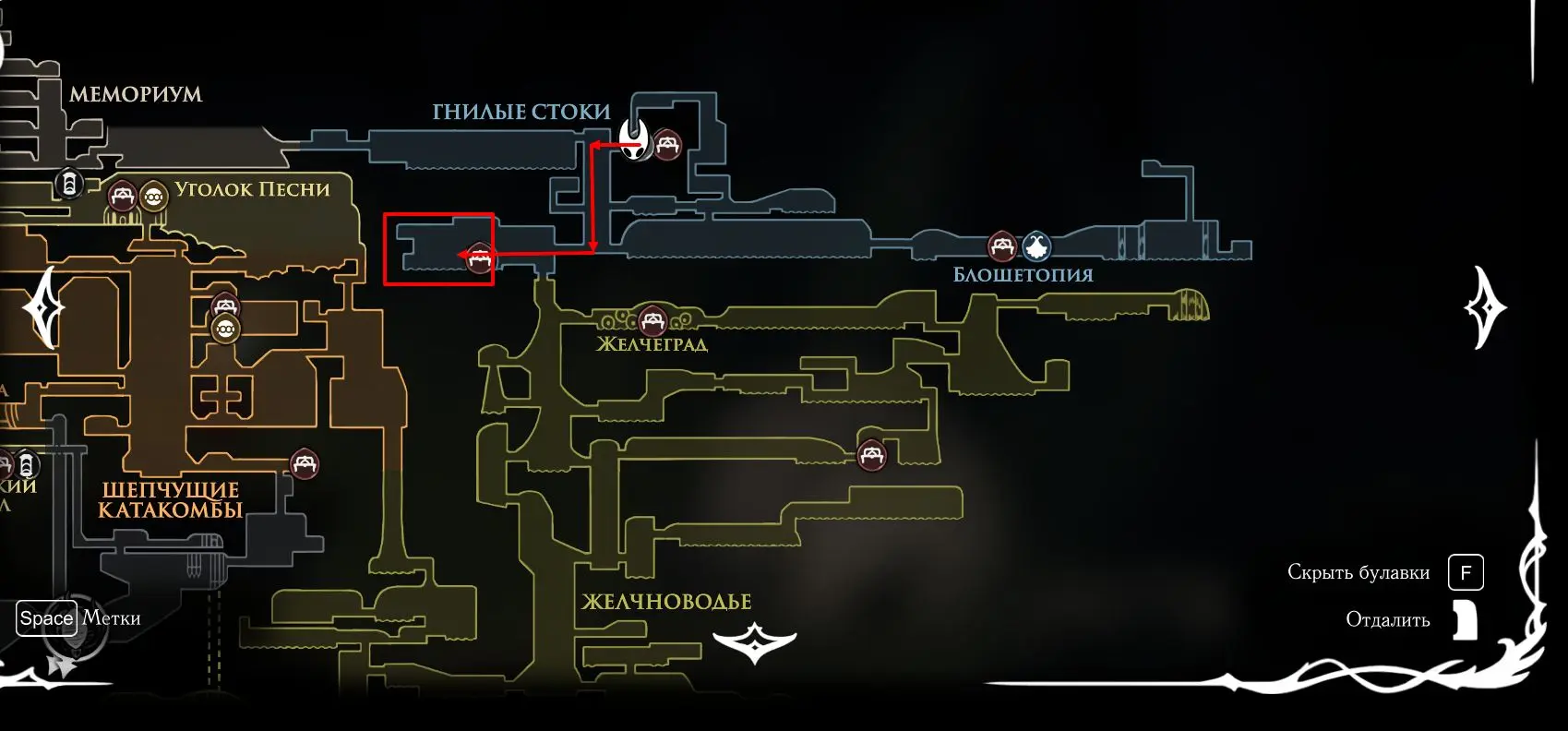 Тайник находится в нижней части локации «Гнилые стоки». Попасть сюда можно с «Желчноводья» или с «Мемориум». Путь начнем со станции «Звонкий путь». Нам необходимо спуститься в самый низ.