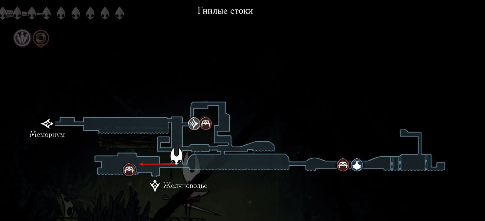 Спрыгиваем в узкий проход. Продолжаем спускаться, пока под нами не окажется переход в «Желчноводье». Отсюда идем налево — в тупиковое помещение, где нас встретит большой червяк.