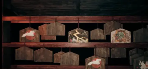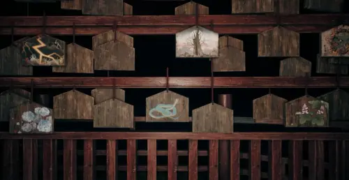 После выхода из зала с алтарем вы оказываетесь на извилистых тропах от восточного храма. Здесь начинается следующая загадка Silent Hill f – поиск трех дощечек эма, маленьких деревянных табличек с изображениями иероглифов и рисунков, за которыми скрыты подсказки к замку от Сокровищницы. На первый взгляд – просто декоративные сувениры, но именно на них зашифрован код к массивной двери, ведущей глубже в храмовый комплекс.
