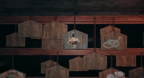 Когда все три эма собраны, Хинако отметит знаки с их обратной стороны в журнале. Теперь можно возвращаться к Сокровищнице – массивной запертой двери у восточного храма.