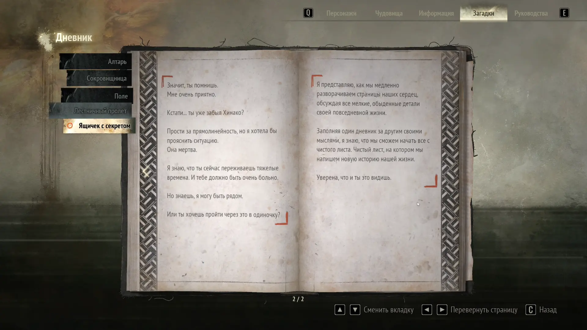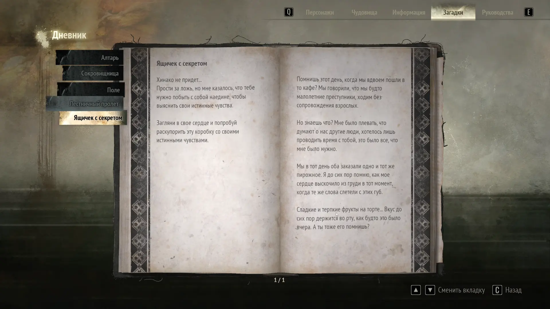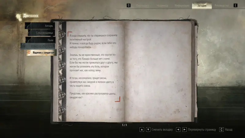 На каждом этапе в письмах Ринко, адресованных Сю есть ключевые слова: «сладкие и терпкие фрукты» – для первого этапа, «страницы» – этап 2, «сакура» – этап 3. Они послужат подсказкой к иконкам, которые нужно открыть, сдвигая плашки. На уровне сложности «Сюжет» эти слова подсвечены в письме, на более сложных уровнях не подсвечены, но логика та же.