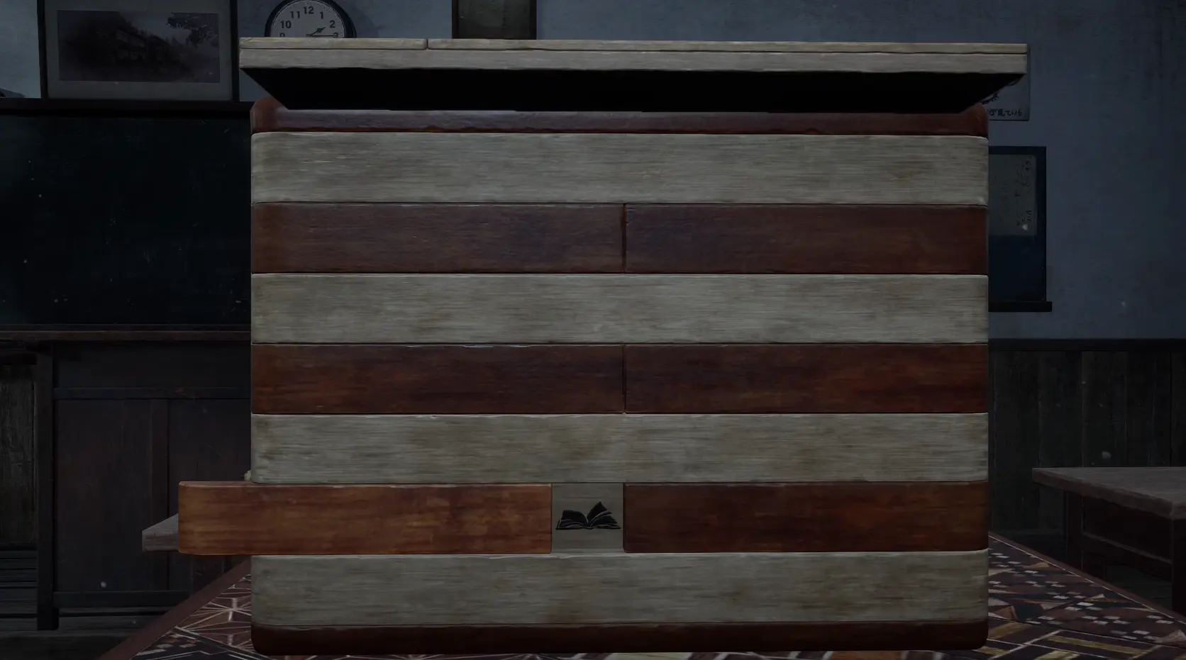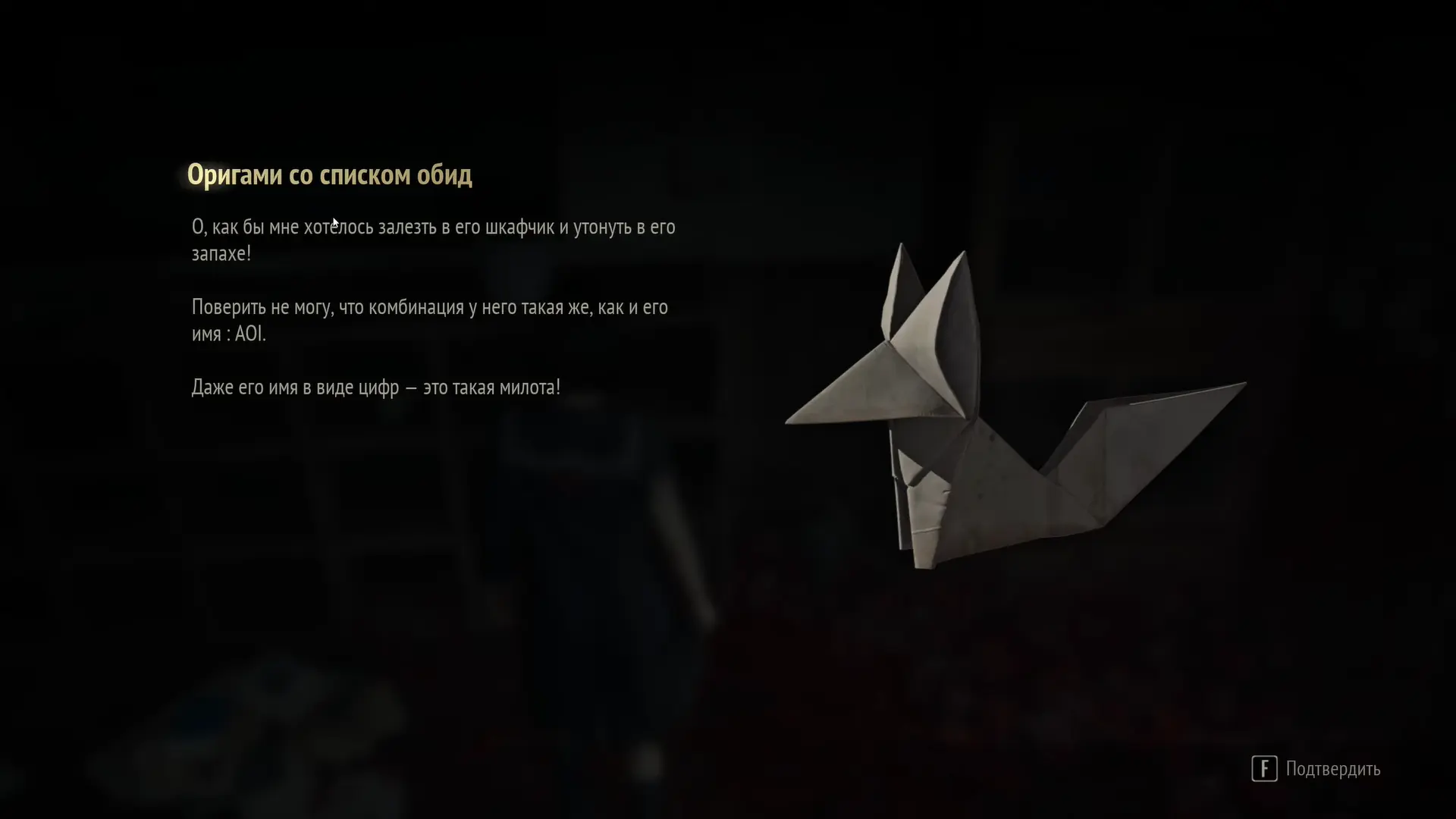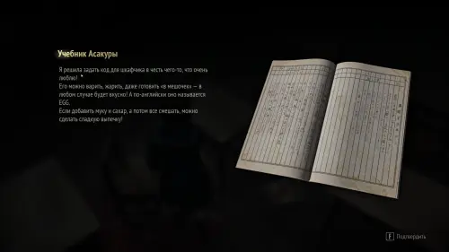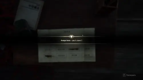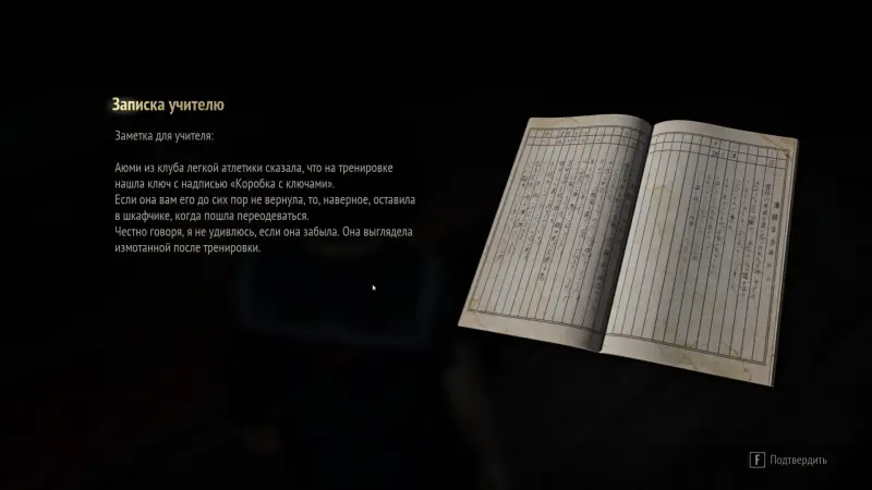 Осмотрев комнату, соберите несколько фигурок оригами, ключ от раздевалки и учебник Асакуры, где спрятан код (он отличается в зависимости от уровня сложности). На столе учителя обратите внимание на записку с пометкой: «Асакура Аюми – ряд 4, место 2» – эта подсказка поможет вам во время лутания кабинета.