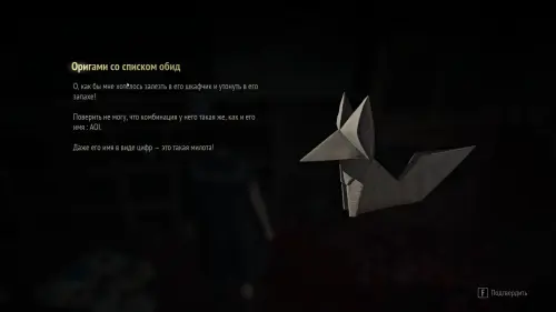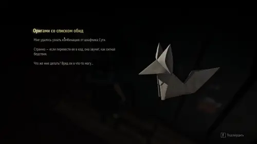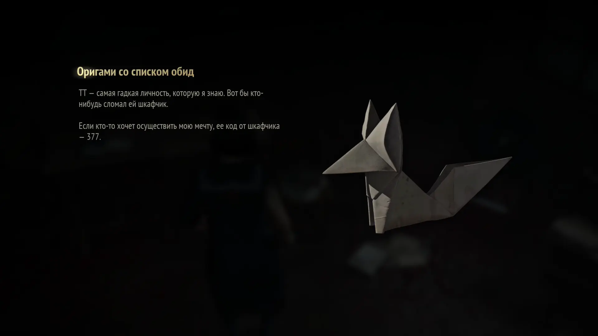 В соседнем кабинете, который открывается тем же ключом, вы найдете оригами-лису – в ней указан код 377, подходящий для шкафчика ТТ.