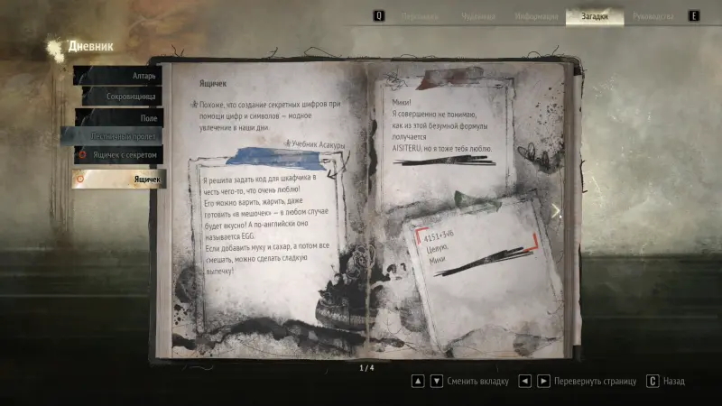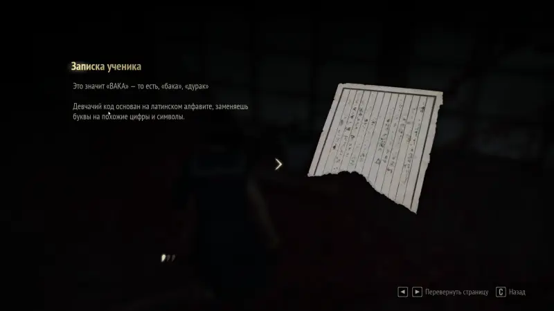 По возвращению обратно в коридор будьте готовы – там заспаунятся манекены и начнут нападать. Отправляйтесь в соседний класс, там вас ждут записки с шифрами: одна содержит код вида 84*4, другая – записка влюбленных с шифром 4151+3ѵ6. Самая дальняя из заметок поясняет, как работает девчачий код: буквы латиницы заменяются цифрами, схожими по форме, плюс есть дополнительные правила (например, 6 = U, Y = x, D = 7).