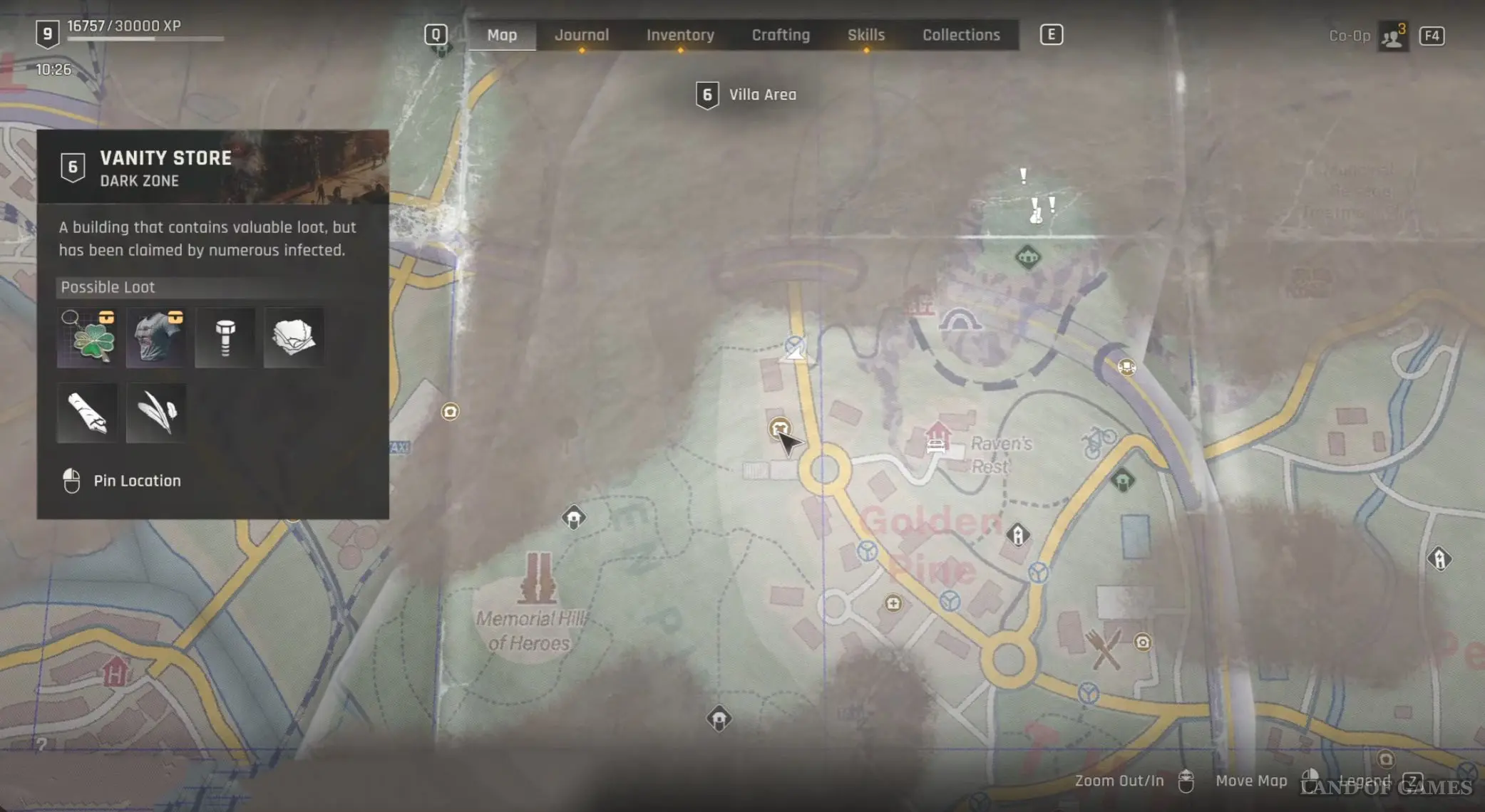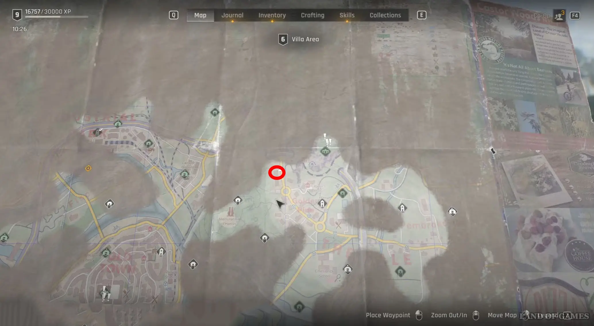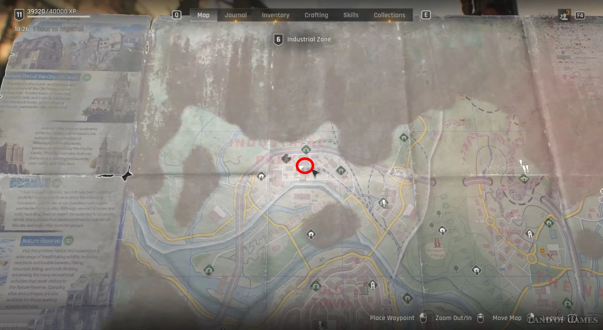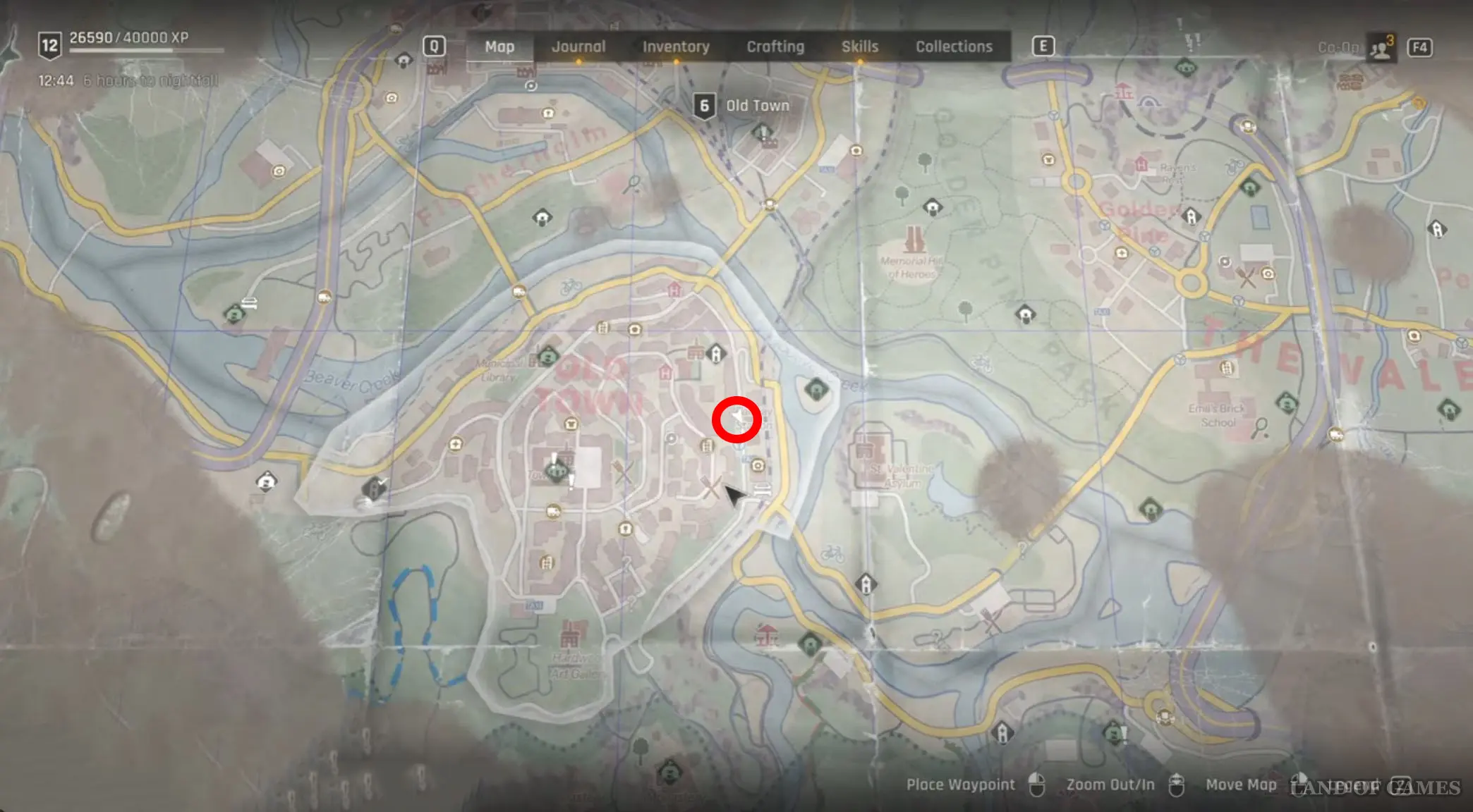 Отправляйтесь на север указанной области и отыщите здание, отмеченное на карте буков «H» – речь идет о гостинице «Оранж». Затем заберитесь на крышу отеля и пройдите внутрь через открытое окно. Поверните направо и спрыгните в отверстие. Войдите в комнату слева, чтобы найти записку с первой подсказкой. Вторая подсказка расположена неподалеку от прохода в магазин в темной зоне.