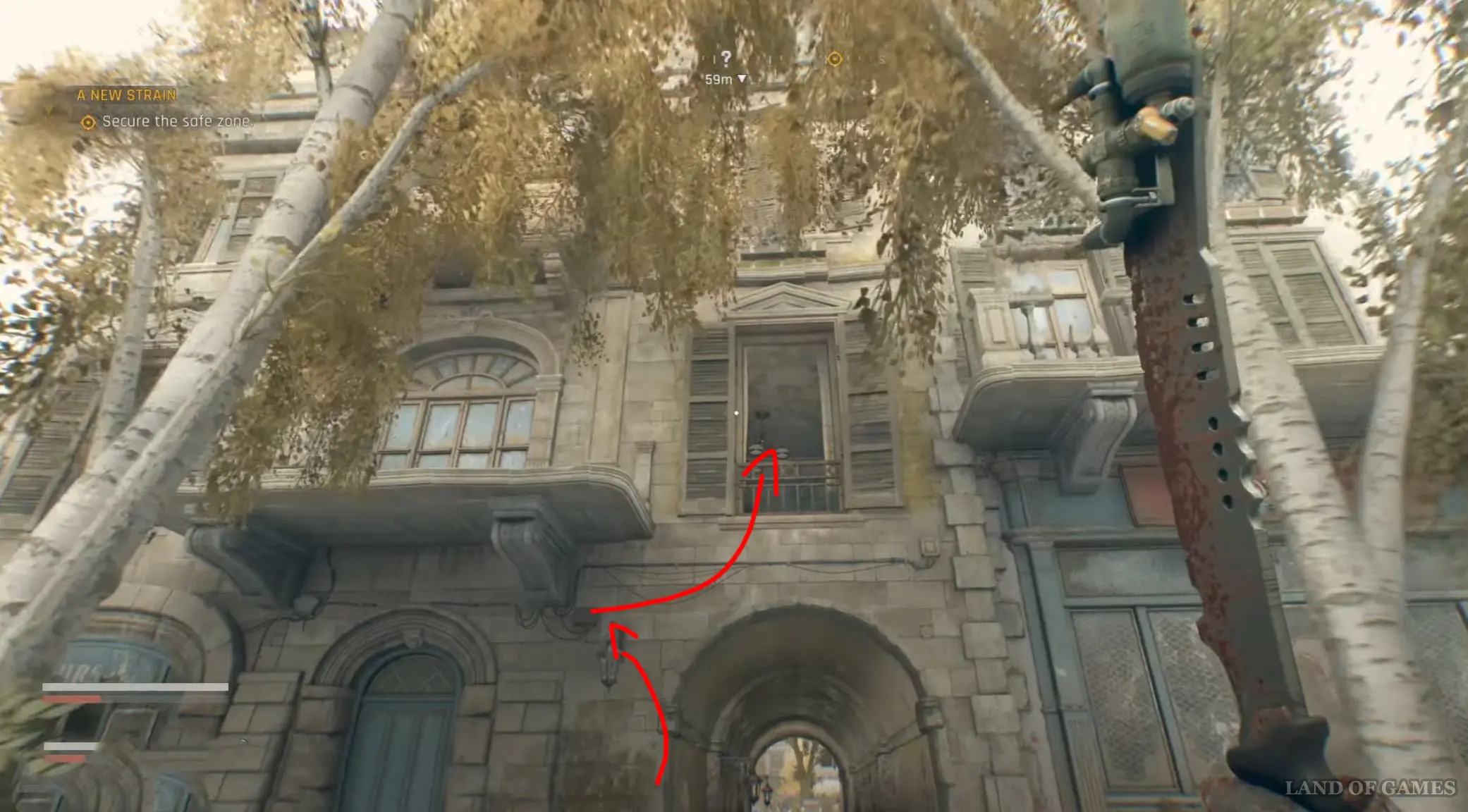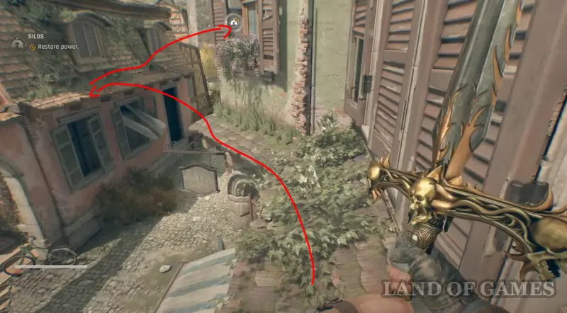 Доберитесь до здания городской Мэрии и пройдите в переулок с правой стороны. Бегите вперед, а затем залезьте на крышу справа и войдите в дом через открытую дверь. Пробегите сквозь него и вылезьте в окошко на противоположной стороне. Поверните камеру вправо, и вы увидите балкончик, на который необходимо запрыгнуть.