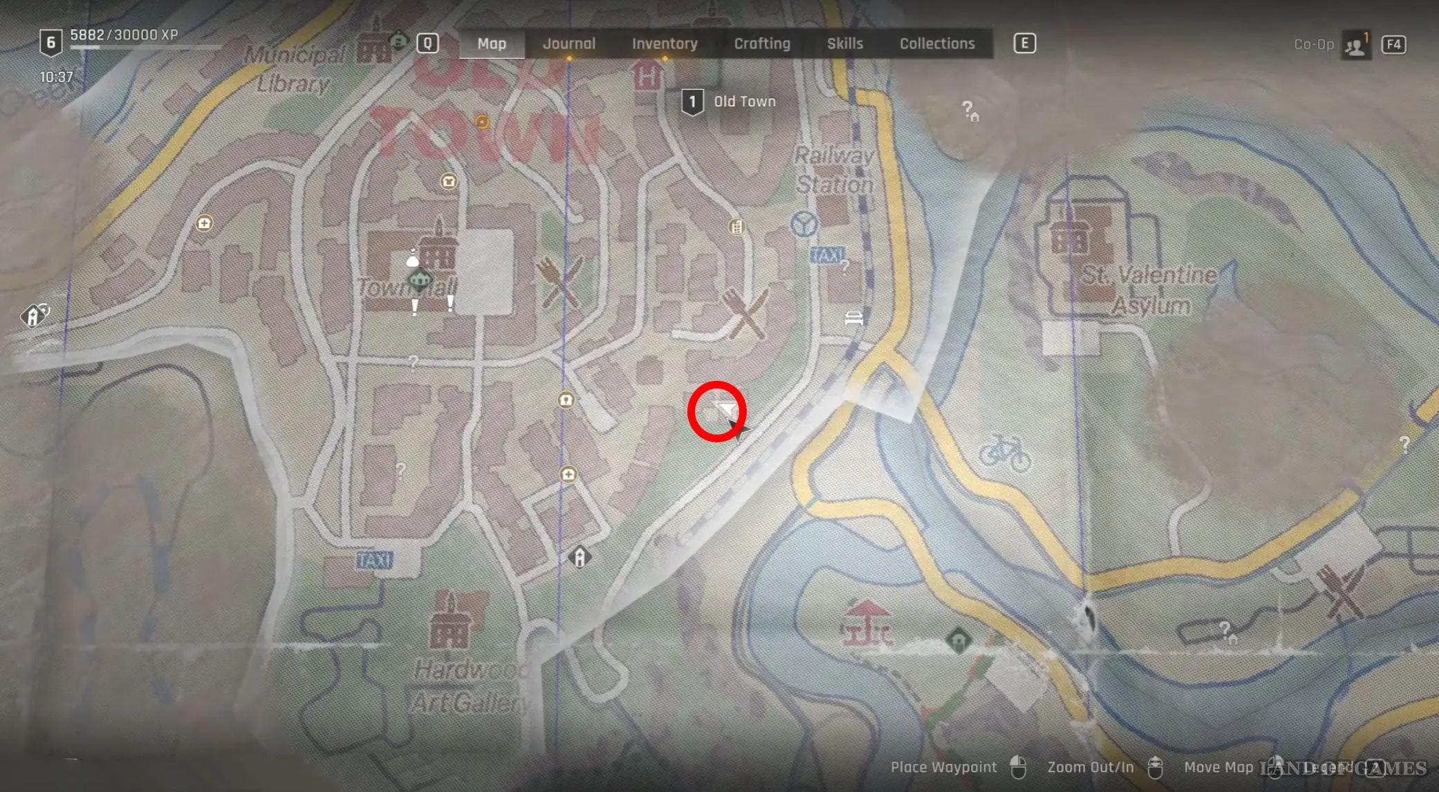 Доберитесь до места, показанного на карте ниже, а потом пройдите на второй этаж желтого дома, поднявшись на выступ и пройдя через открытую дверь. Идите на противоположную сторону квартиры. В гостиной вы найдете на столике сейф, а рядом с ним будет записка с подсказкой. Нужно также решить уравнение на доске, посветив на нее ультрафиолетом.