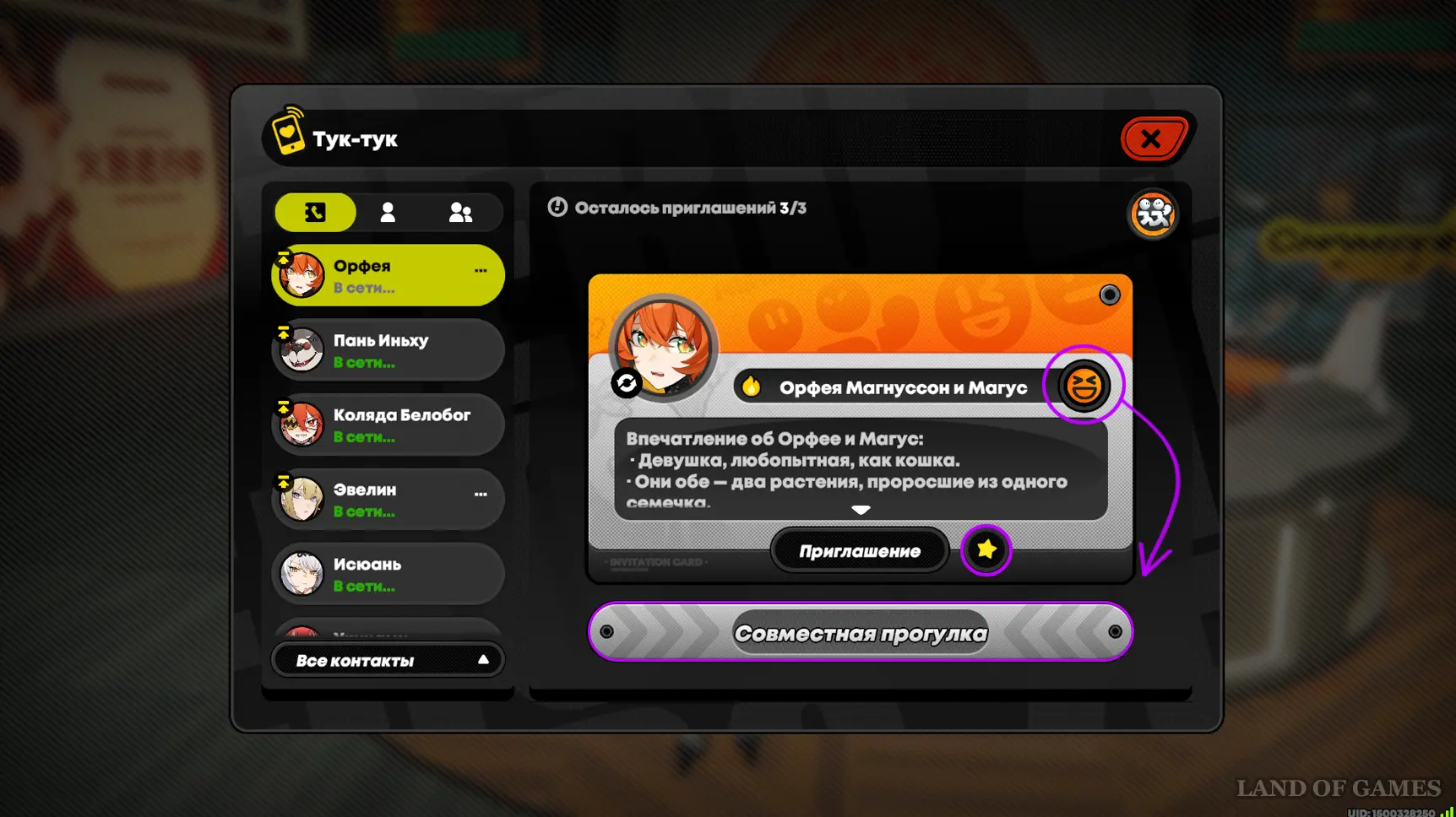Режим «Совместной прогулки» не привязан к приглашениям в чате и может быть запущен неограниченное количество раз. Зайдите в чат с Орфеей и кликните по одноименной кнопке, чтобы попасть в отдельное меню (она появится после получения зеленого ранга Симпатии). Тут показаны живые обои, снизу есть значок с наградами и действие «Провести время» – жмем и выбираем место встречи (прогулки с прописанным сценарием помечаются квестовой меткой; после первого прохождения их можно выбирать во всплывающем меню над списком доступных локаций).