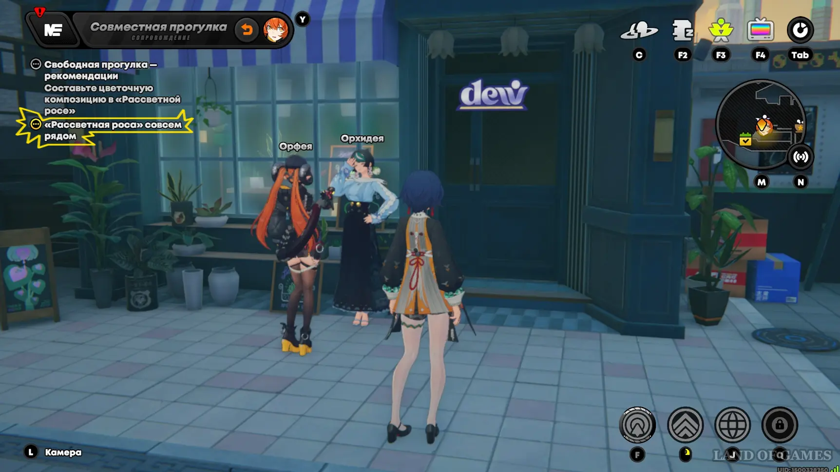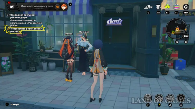 Выполнив 12 заказов флориста в рамках события «О сокровенном на языке цветов», вы разблокируете вход в цветочную лавку «Рассветная роса». Пригласите военных на свободную прогулку по площади Люмины, зайдите в магазинчик Орхидеи и составьте цветочную композицию (букет собирается автоматически, награда: 5 тысяч денни).