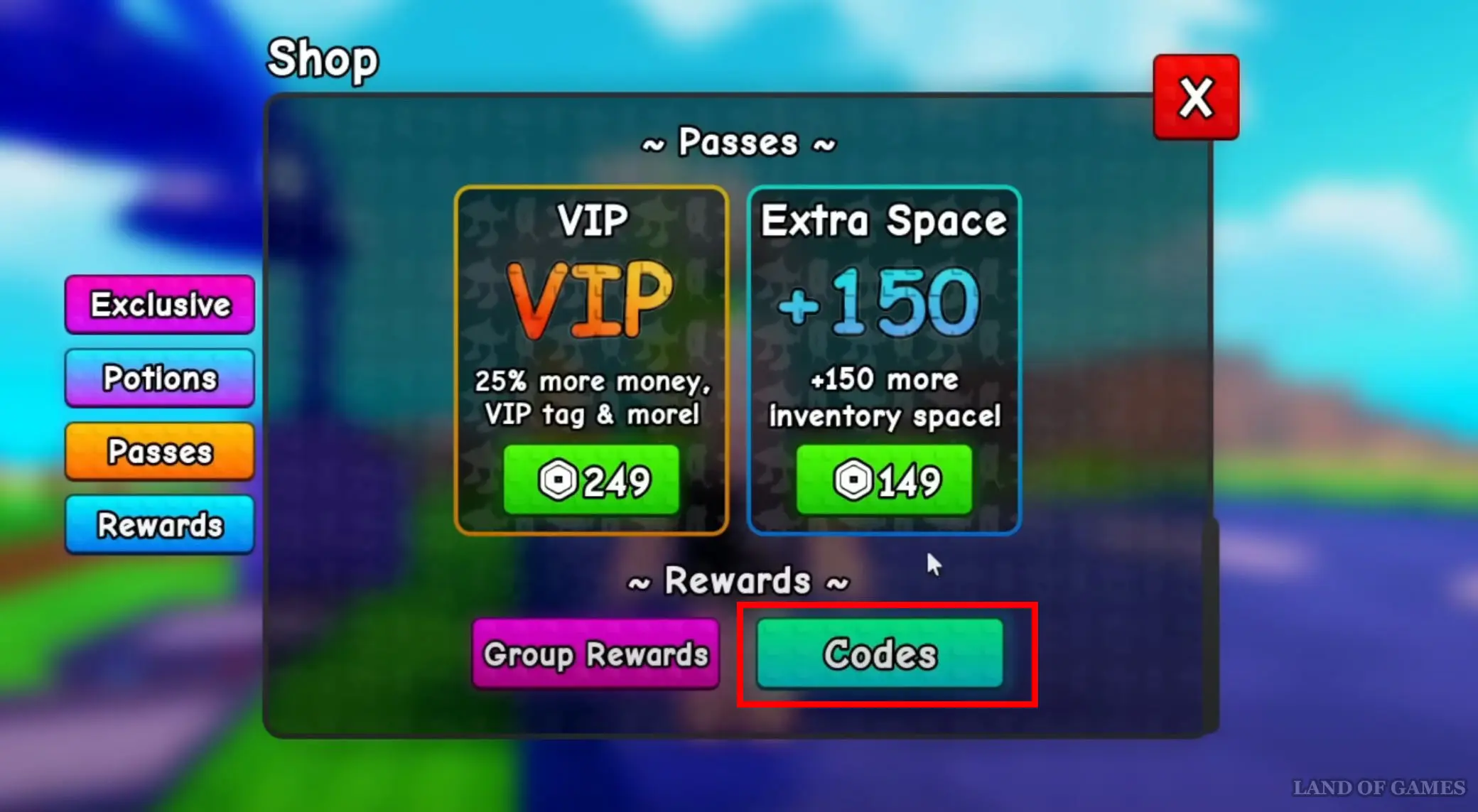 - В появившемся окошке перейдите на вкладку «Награды» (Rewards), нажав на голубую кнопку слева. Здесь кликните на кнопку «Codes» (Коды), а затем введите в возникшее текстовое поле один из вышеуказанных промокодов и нажмите на кнопку «Claim» (Получить).