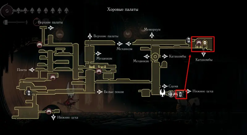 Проще всего попасть туда через лифт, который находится на станции «Звонкий узел» в «Хоровых палатах». Перемещаемся в «Первый алтарь».