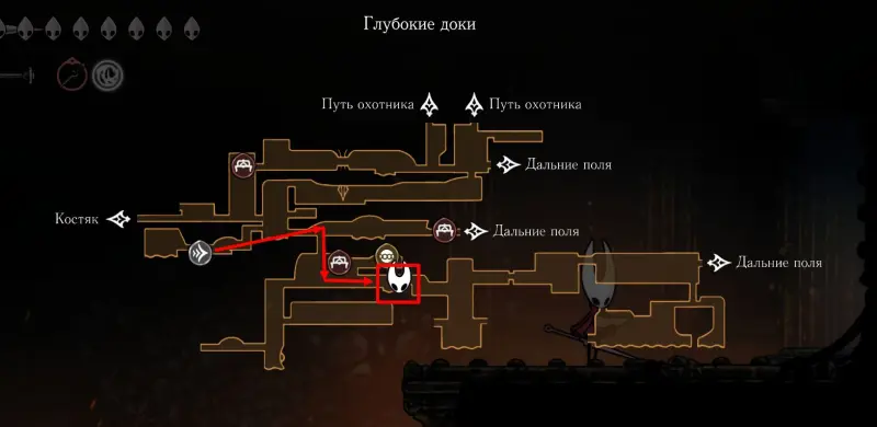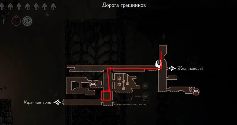 Попасть туда можно двумя путями. Вы можете пойти длинной дорогой через «Мрачные топи», если еще не успели открыть «Желчноводье». Если же карта уже открыта, то тогда бежим через кратчайший путь по кислотным водам.