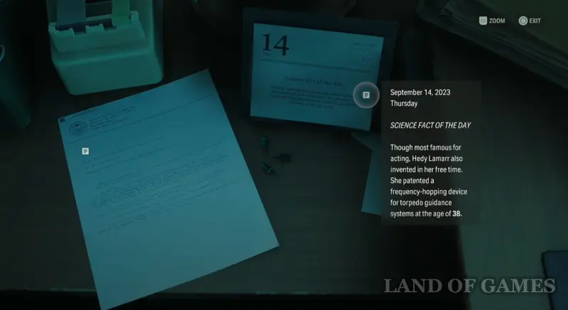 Вы столкнетесь с системой поиска и разгадывания паролей практически в самом начале дополнения. Все коды от компьютеров состоят из 6 цифр, а для их разгадывания зачастую нужно просто внимательно изучить окружение. Итак, первым делом взаимодействуйте с календарем на столе, стоящем слева от монитора, в котором указан возраст Хеди Ламарр – 38 лет (это последние две цифры пароля).