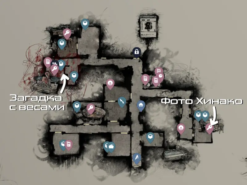 Комната с фотографиями находится на первом этаже карты Дом семьи Симидзу I, к северу от кухни. На стенах – снимки семьи Хинако и ее друзей. Но портрет самой Хинако кто-то убрал, а групповое фото испорчено – лица зачеркнуты, чернила растеклись, оставив смазанные пятна.