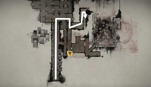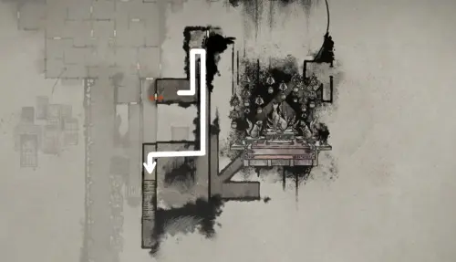 Путь к «Багровой воде» открывается только в НГ+, в главе 9, когда при перемещении в иной мир игра даст вам квест гнаться за Лисьей Маской. Следуйте вверх по лестнице до комнаты с частично разрушенным полом. На одной из стен вы увидите кровавый след, вам нужно рассеять иллюзию и открыть проход. Далее идет узкий коридор, упирающийся в запертую дверь, за ней и скрыта Обитель багряной воды.
