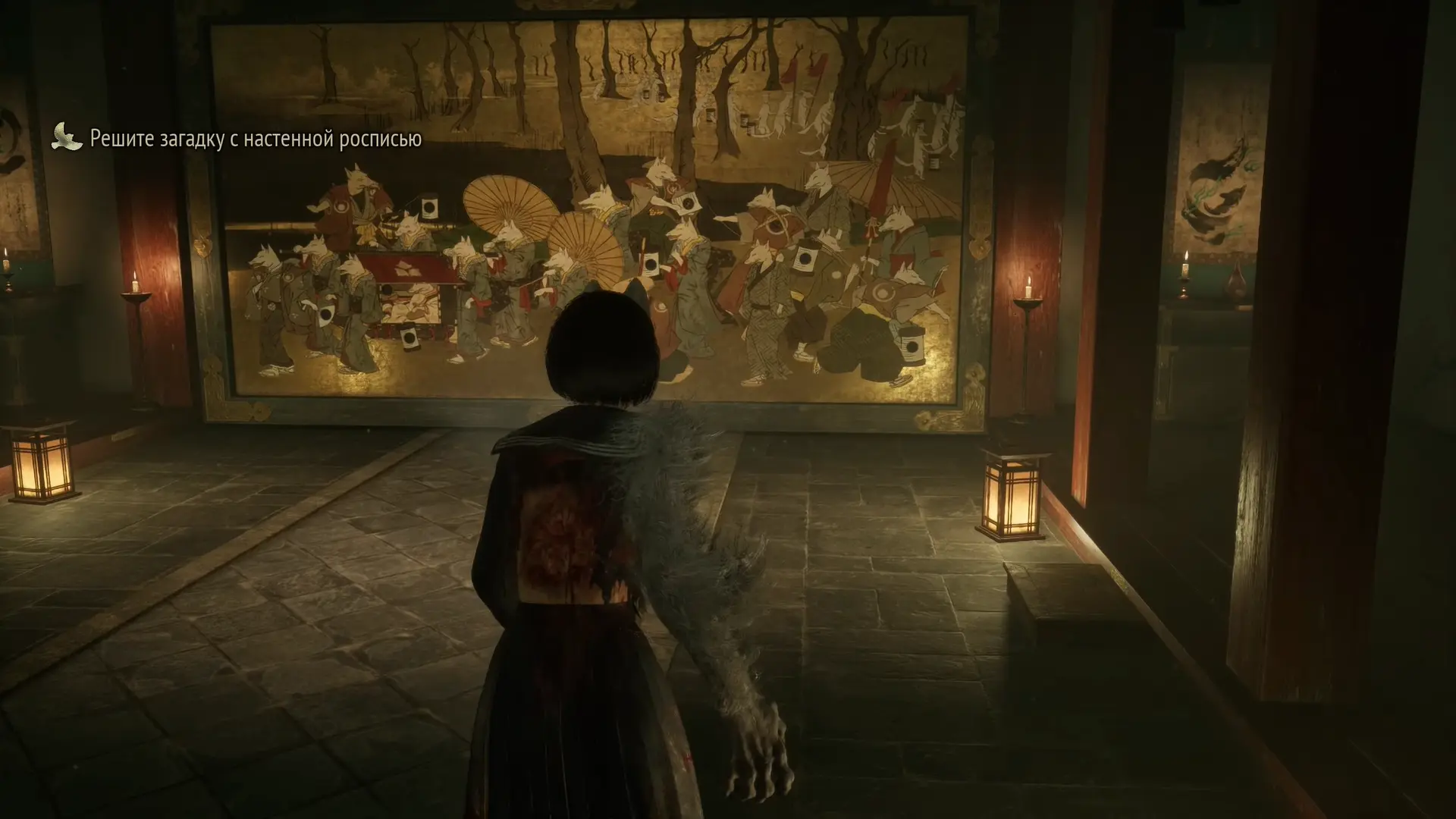 Огромная фреска с изображением шествия лисиц – кульминация символизма Silent Hill f. Здесь вам нужно разместить три эмблемы – маску лисы, белого воробья и черного воробья в определенных слотах. Подсказку дает поэма рядом на стене, но решение зависит от концовки, к которой вы идете. Если не хочется ломать голову, нужную комбинацию для каждой из концовок можно подсмотреть в отдельном гайде по этой загадке.