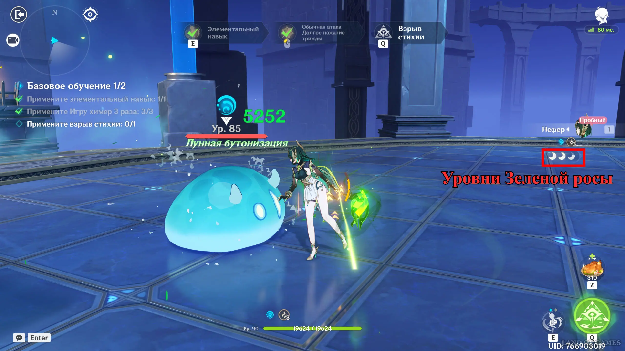 Что касается третьей пассивки «Дочь пыли и песка», то при активном Танце тени и переходе в состояние Скользящей змеи в течение 5 секунд после активации участниками команды Лунной бутонизации Нефер начнет периодически восстанавливать Зеленую росу. За каждые 100 единиц мастерства стихий свыше 500 данный эффект возрастает на 10% (максимум – 50%).