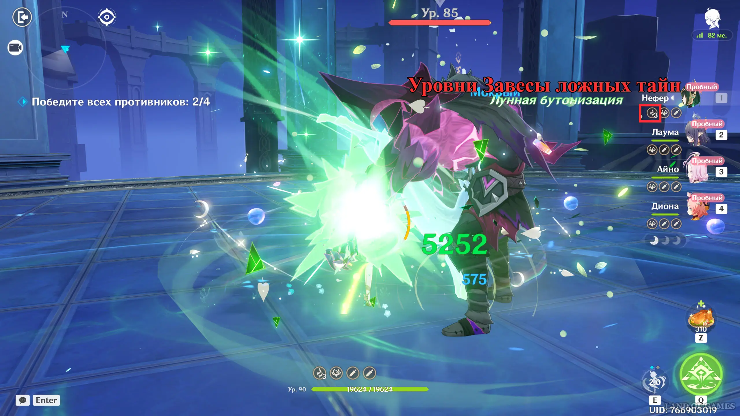 Игра химер на деле включает в себя 5 ударов, осуществляемых автоматически, то есть вам достаточно просто зажать ЛКМ. При этом первые два удара совершает Нефер (они наносят обычный Дендро урон), а последние три – Тень (наносят урон Лунной бутонизации). Множитель первых двух скейлится и от силы атаки и от мастерства стихий, а последних – только от МС, причем на 10-м уровне способности их общий показатель равен 576%, что делает их основным источником урона девушки-змеи.