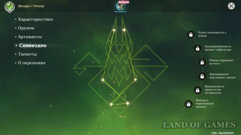 | Успех или поражение начинаются с плана | Увеличивает базовый урон Лунной бутонизации Игры химер на 60% от мастерства стихий Нефер. Данный эффект получает аналогичный бафф от Завесы ложных тайн. | Усиленные заряженные атаки, являющиеся главным источником урона Нефер, становятся еще сильнее. Отличная конста, которая просто делает героиню сильнее. |