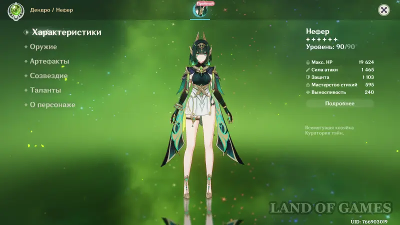 В Genshin Impact Нефер является 5-звездочным персонажем, который относится к Дендро стихии и использует в бою катализатор. В отряде она может играть роль основного дамагера/гиперкерри, способного наносить существенный урон своими заряженными атаками. В этом гайде мы в подробностях расскажем вам про ее лучший билд, оружие и артефакты, а также рекомендуемые с ней команды.