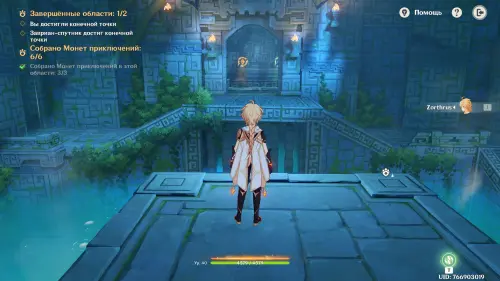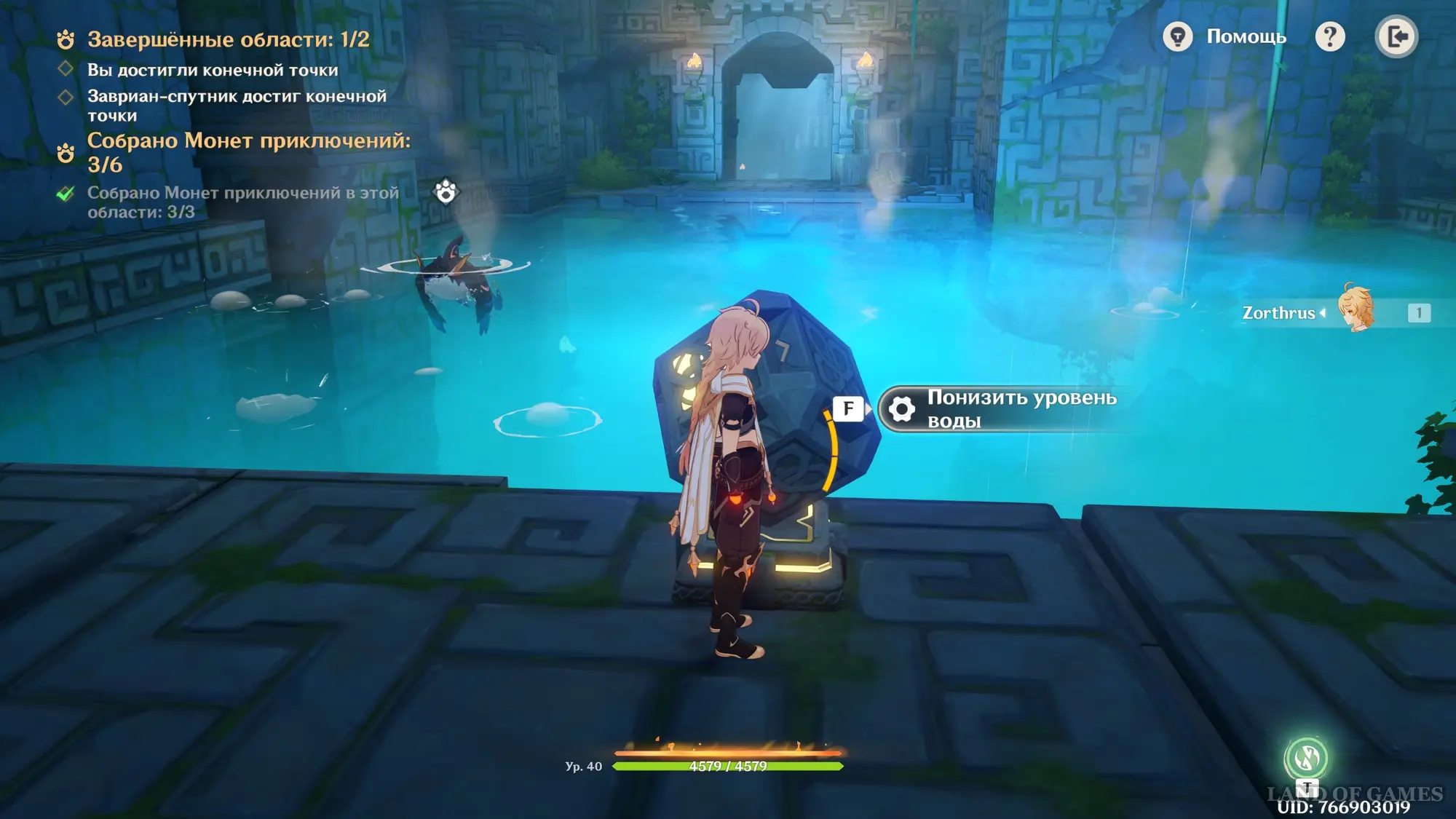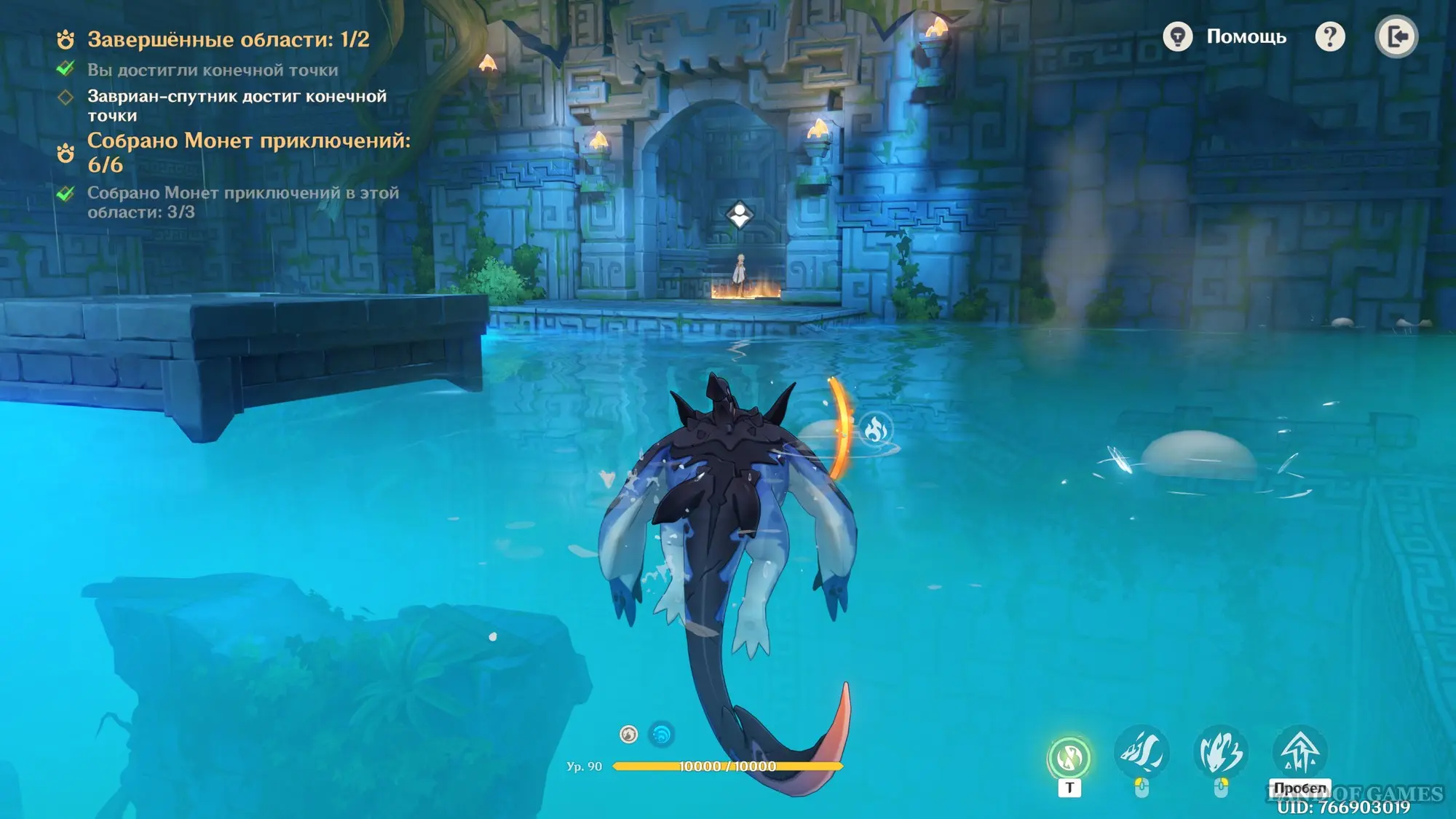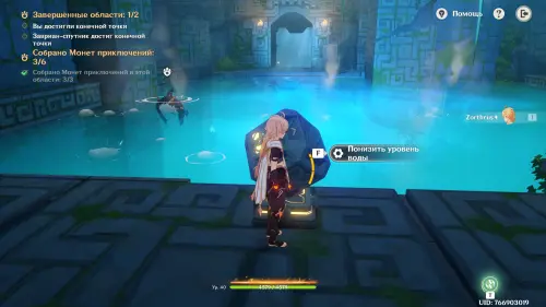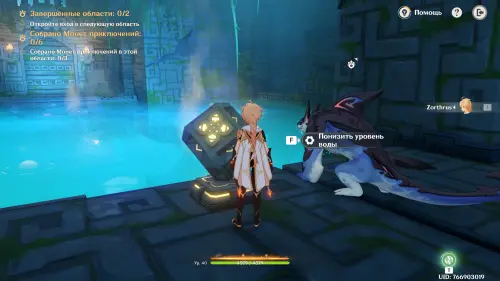 Далее переключитесь на завриана (клавиша «Т») и спрыгните в водоем, собрав две монеты приключения. Вернитесь в тело Путешественника и вновь нажмите на консоль, вовсе убрав воду. Теперь спуститесь вниз по лестнице и активируйте второй куб, чтобы открыть дверь. Весь процесс продемонстрирован на гифке ниже.