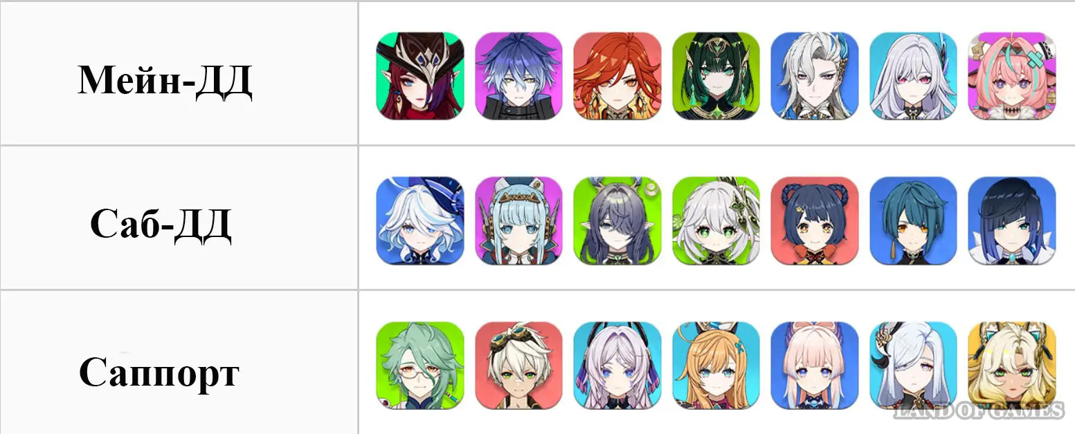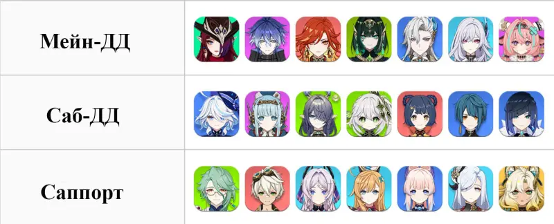 | Мейн-ДД | Саб-ДД | Саб-ДД/Поддержка | Поддержка |