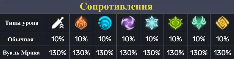 В обычном состоянии этот противник не обладает какой-либо особой устойчивостью к тому или иному элементу, то есть сопротивление ко всем стихиям у него составляет 10%. Однако после входа в состояние Вуали мрака его устойчивость ко всем элементам тут же возрастает до 130%. К тому же, выйдя из состояния Вуали мрака, он меняет тип своего элемента на тот, которым ему был нанесен наибольший урон во время действия этого особого режима, из-за чего он становится невосприимчив к этой стизии. Поэтому в теории неважно, каких именно персонажей вы выставите против босса, но на практике все несколько сложнее (читайте подробнее в разделе о подборе героев).