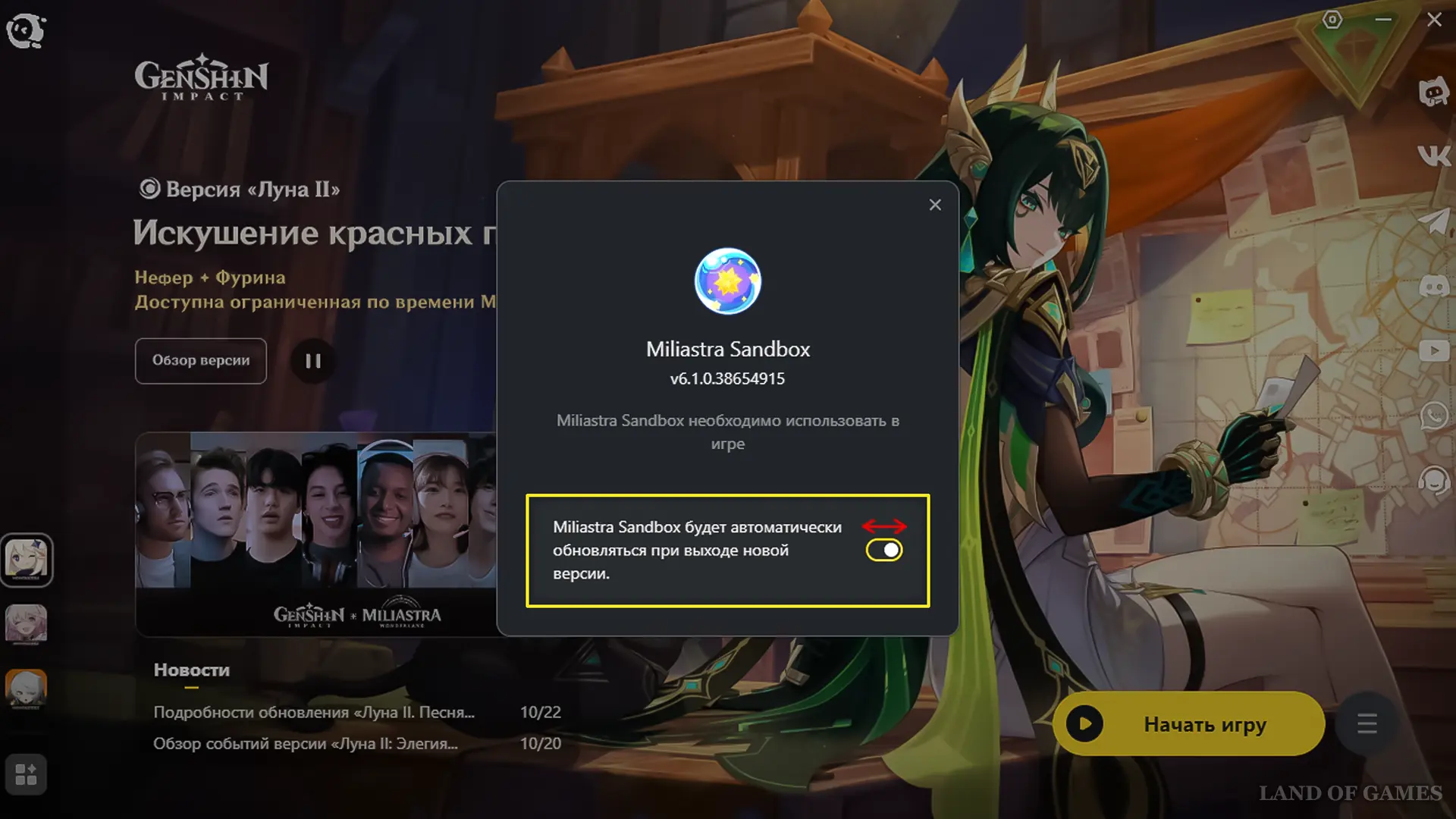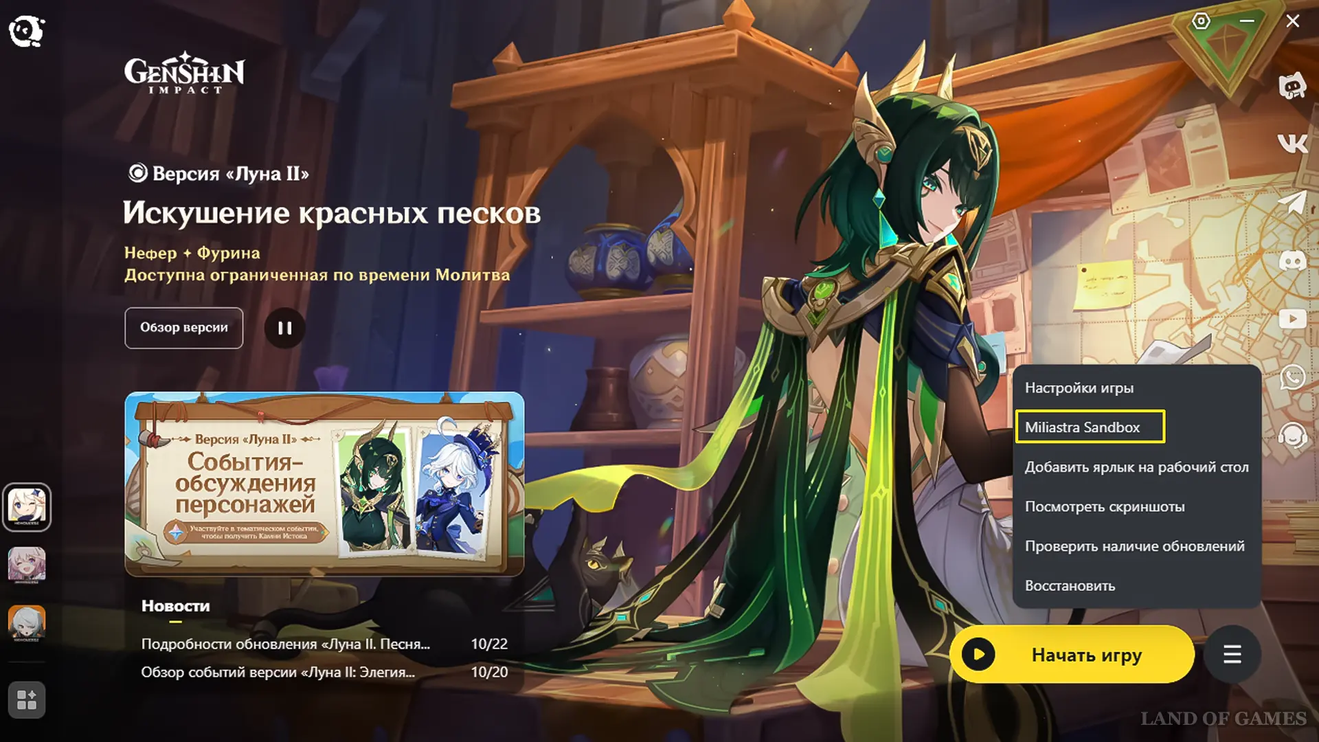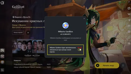 Если вы не горите желанием использовать новый режим, то зайдите в лаунчер HoYoPlay, затем откройте контекстное меню (значок с тремя полосками) справа от кнопки «Начать игру» и кликните «Milliastra Sandbox» — вкладка отвечает за обновления Астрального предела, ее отключение ограничит подгрузку лишних ресурсов.